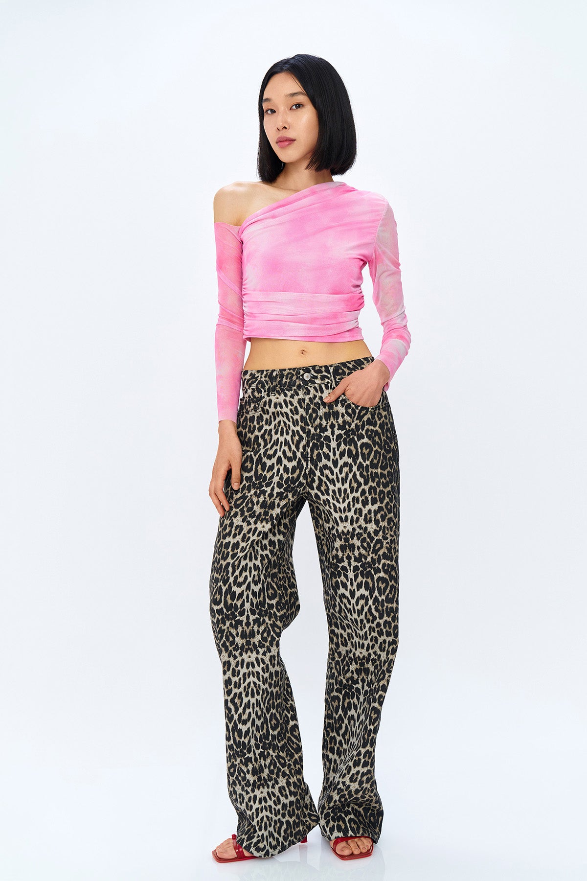 Drapeli, asimetrik yaka, tüllü, uzun kollu crop bluz.