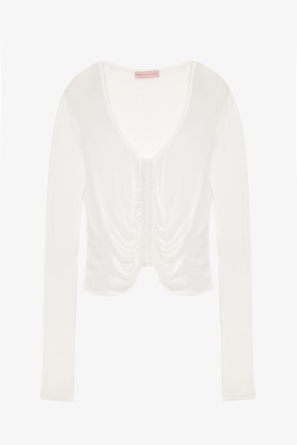 Önü Büzgülü V Yaka Transparan Bluz Ekru