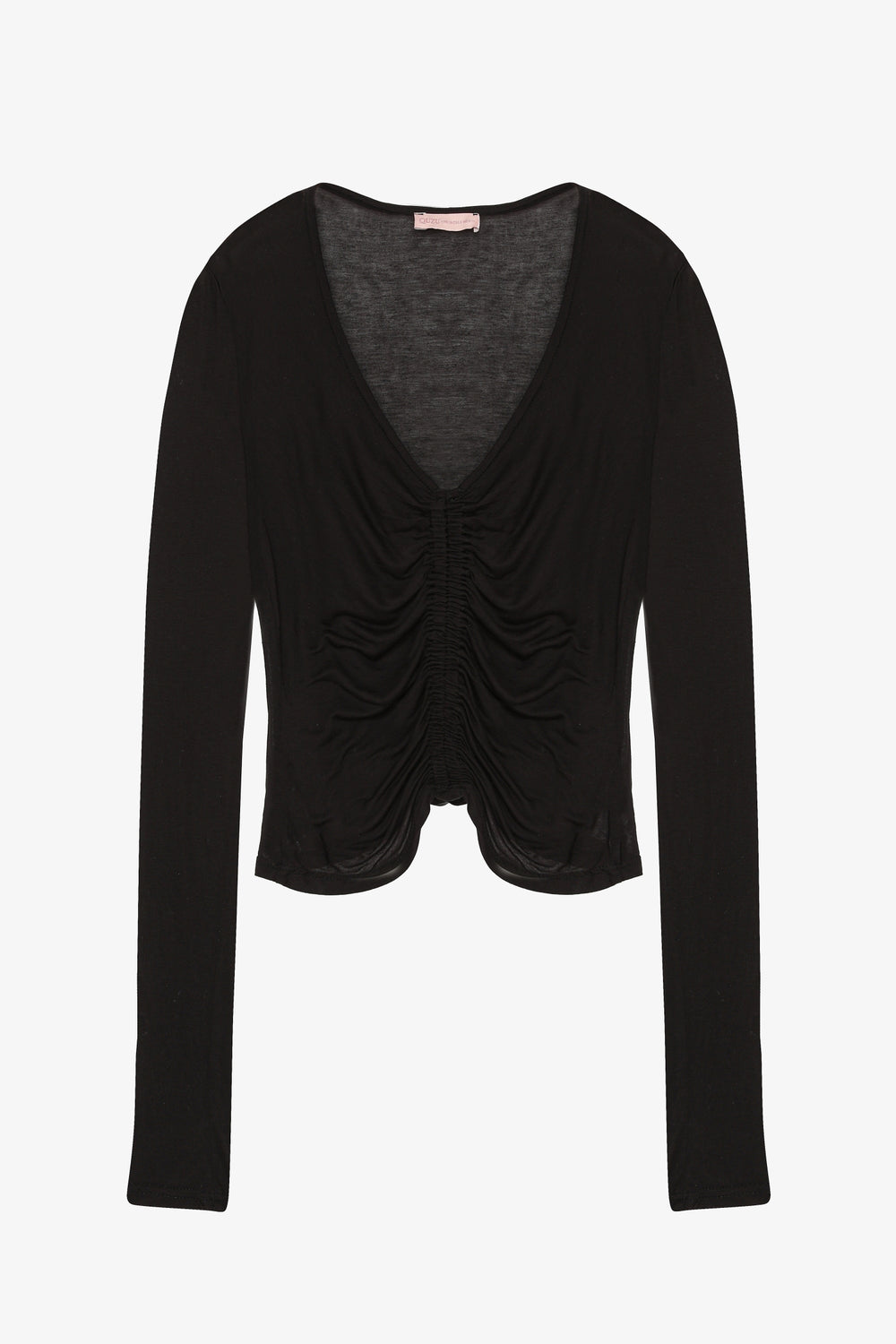 V yaka kesimli, ön kısmı lastik büzgü detaylı, uzun kollu, rahat kalıp, ince kumaştan transparan görünümde bluz.