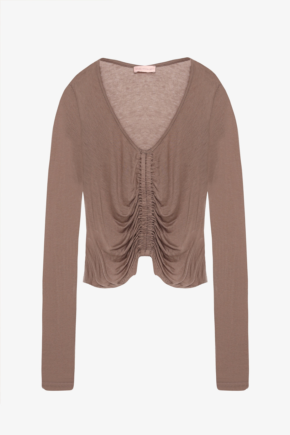 V yaka kesimli, ön kısmı lastik büzgü detaylı, uzun kollu, rahat kalıp, ince kumaştan transparan görünümde bluz.