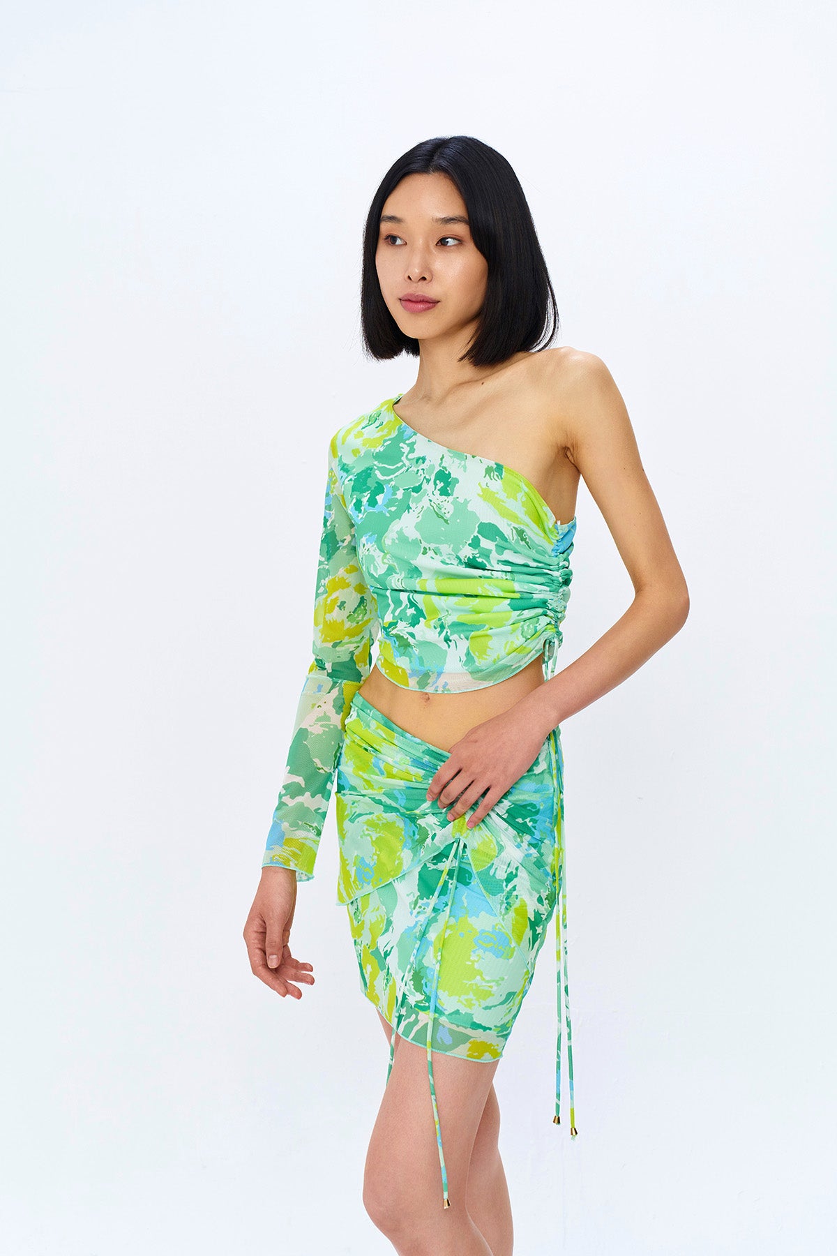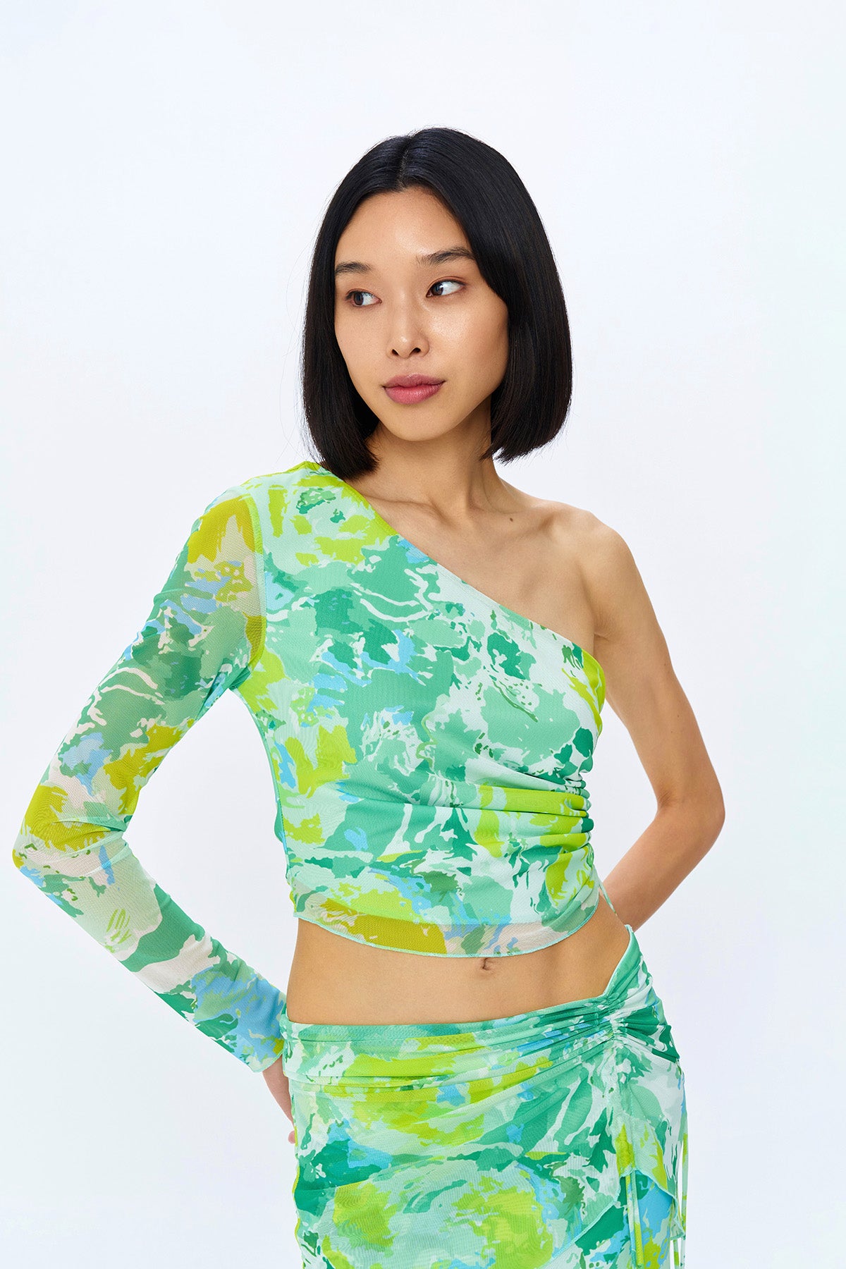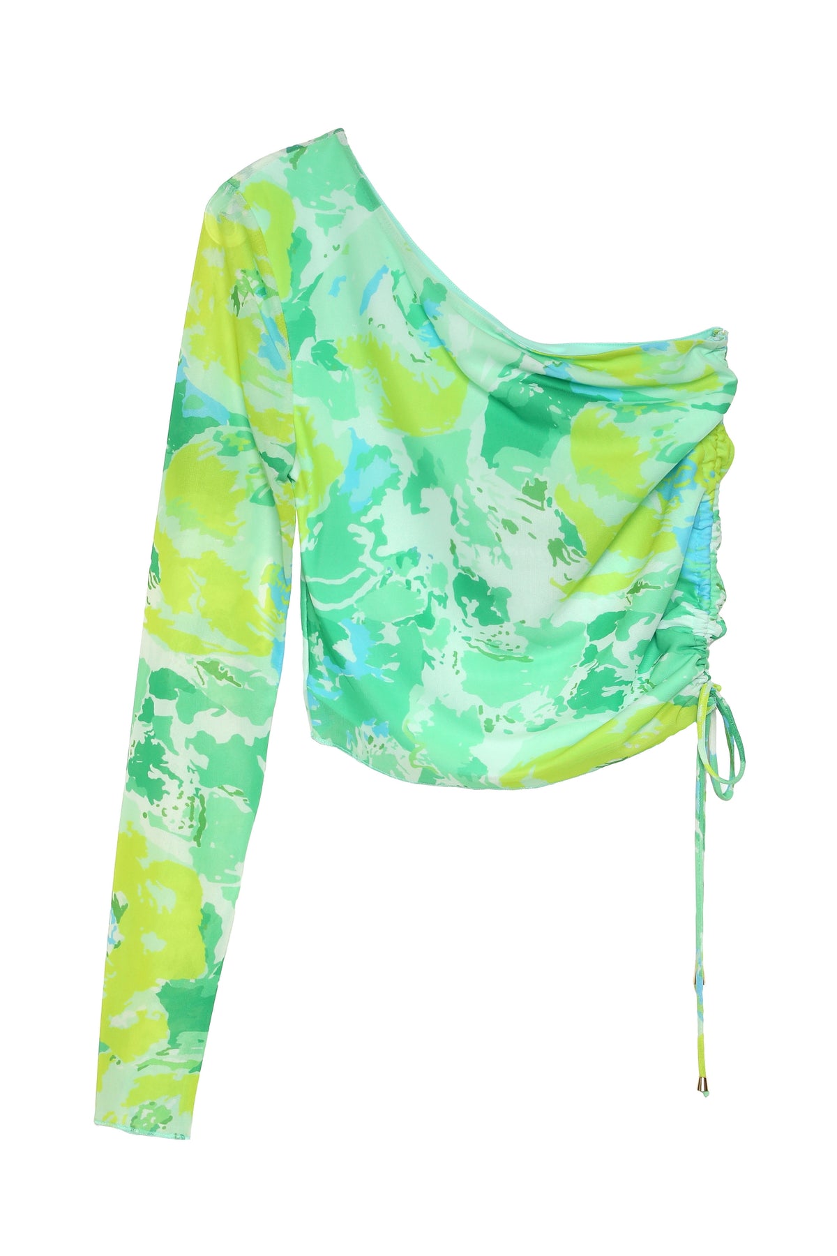 Tek omuz,renkli desenli, uzun kollu, büzgü detaylı, crop bluz.