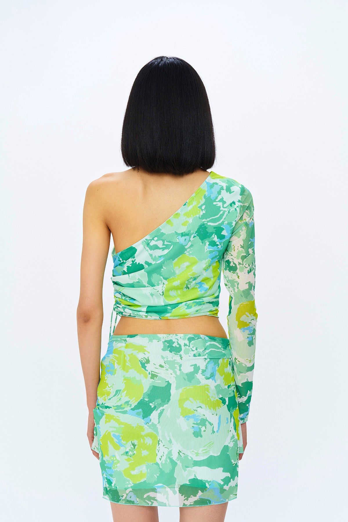 Renkli Desenli Tek Omuz Tül Bluz Mint