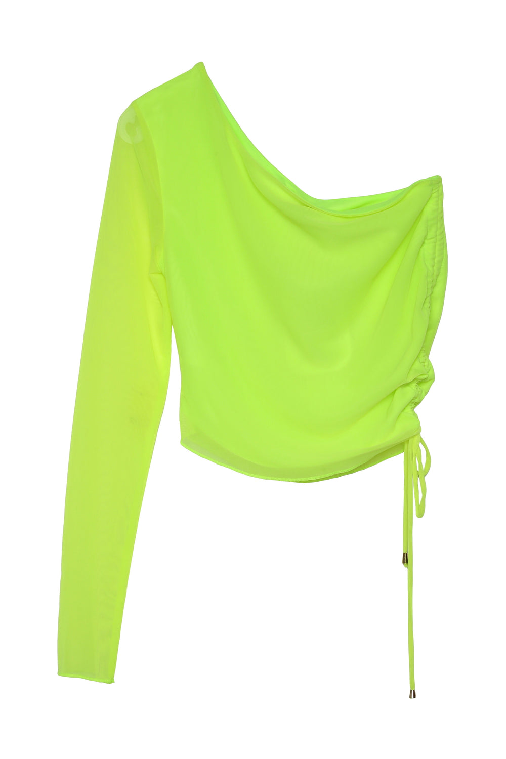 Yanı Büzgü Detaylı Tek Omuz Tül Bluz Neon Sarı