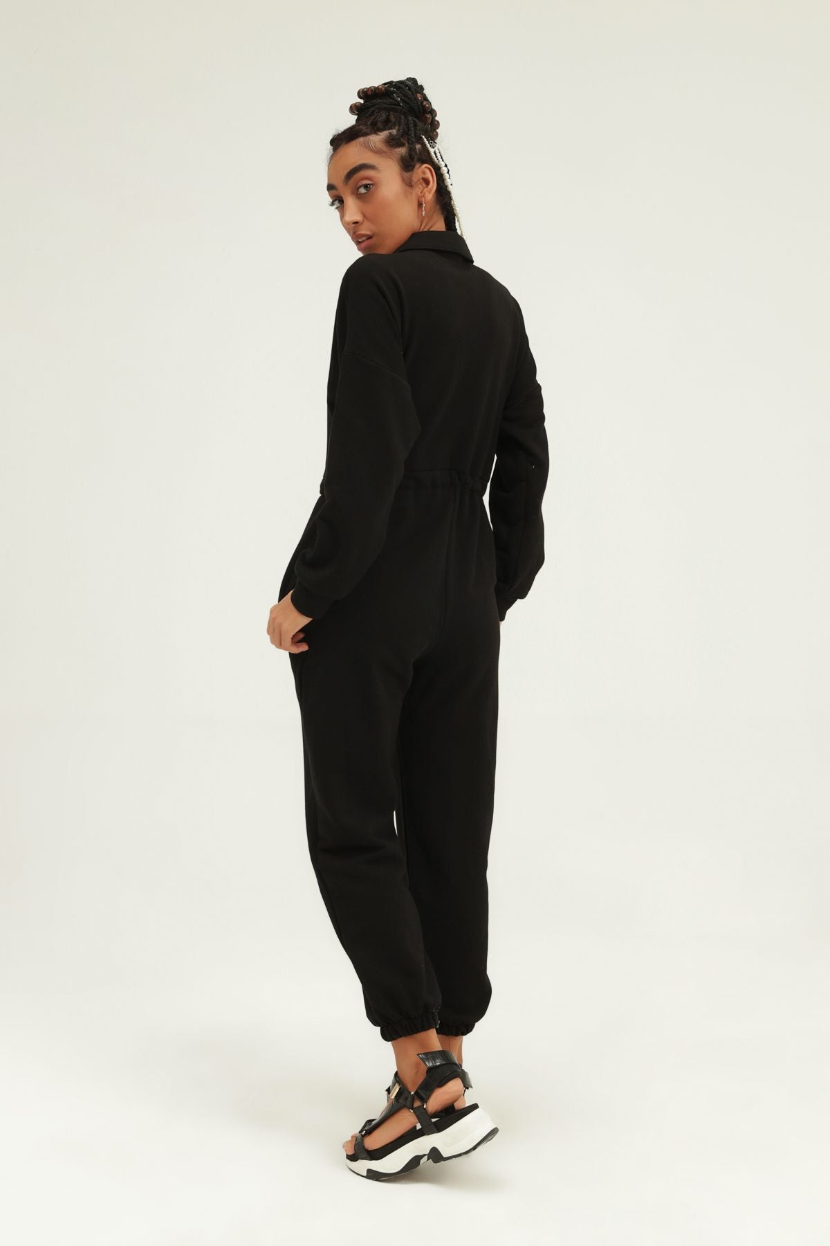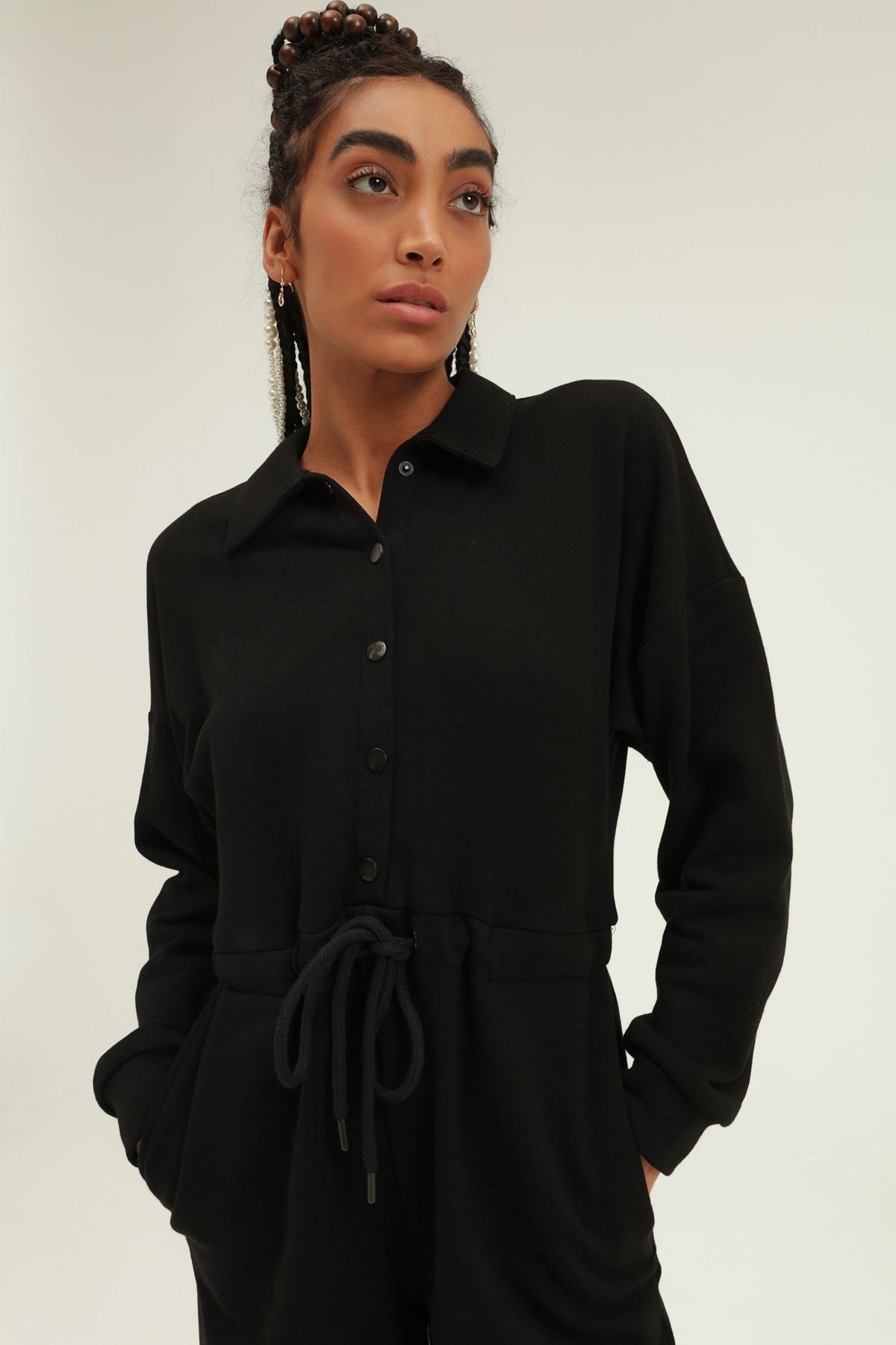 Beli Büzgülü Gömlek Yaka Tulum Siyah