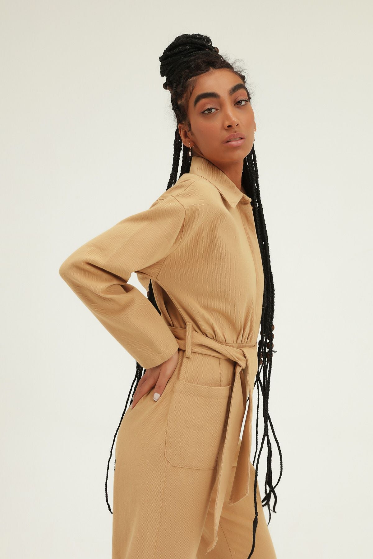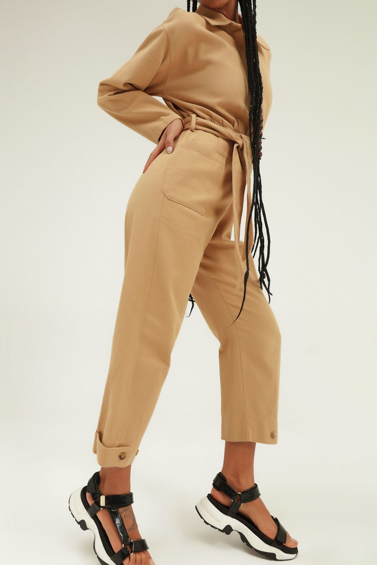 Kemerli Gömlek Yaka Tulum Camel