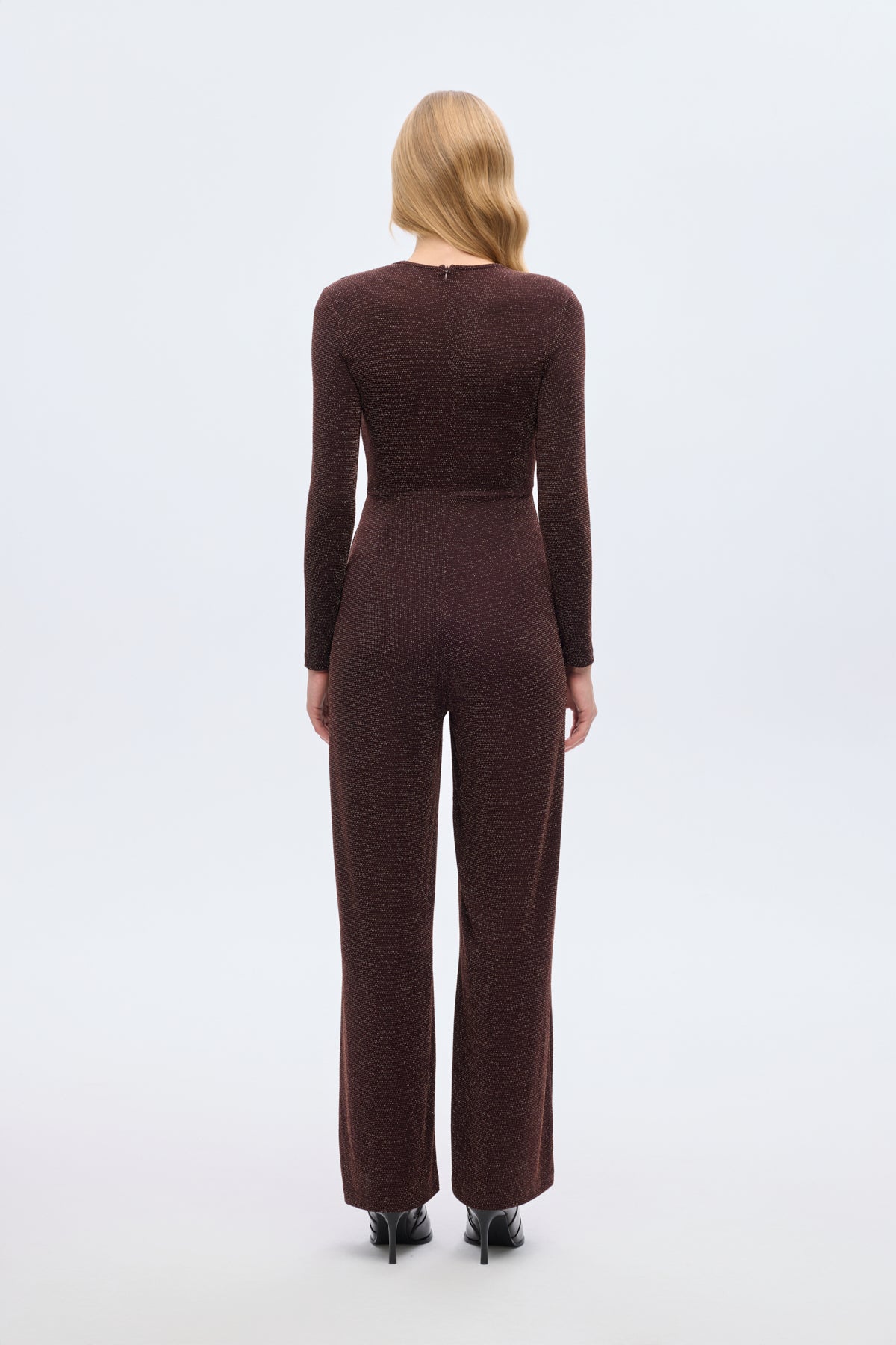 Sim dokulu, kruvaze yaka, uzun kollu, arkadan fermuarlı, geniş paça, modern görünüm sunan uzun tulum.