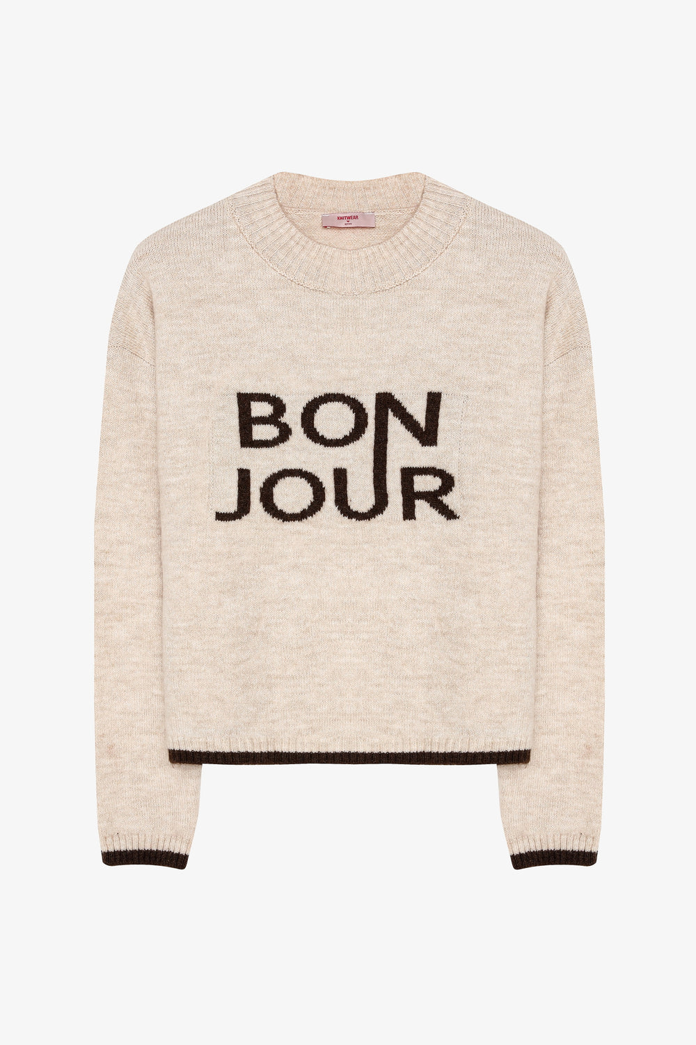 Bonjour Yazılı Bisiklet Yaka Triko Kazak Krem