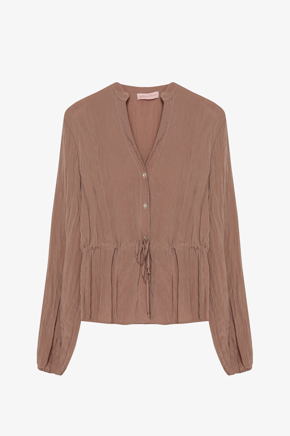 Bilek kısmı büzgü detaylı, önden düğmeli, v yaka, uzun kollu, dokulu buruşuk kumaştan, beli bağcıklı gömlek.