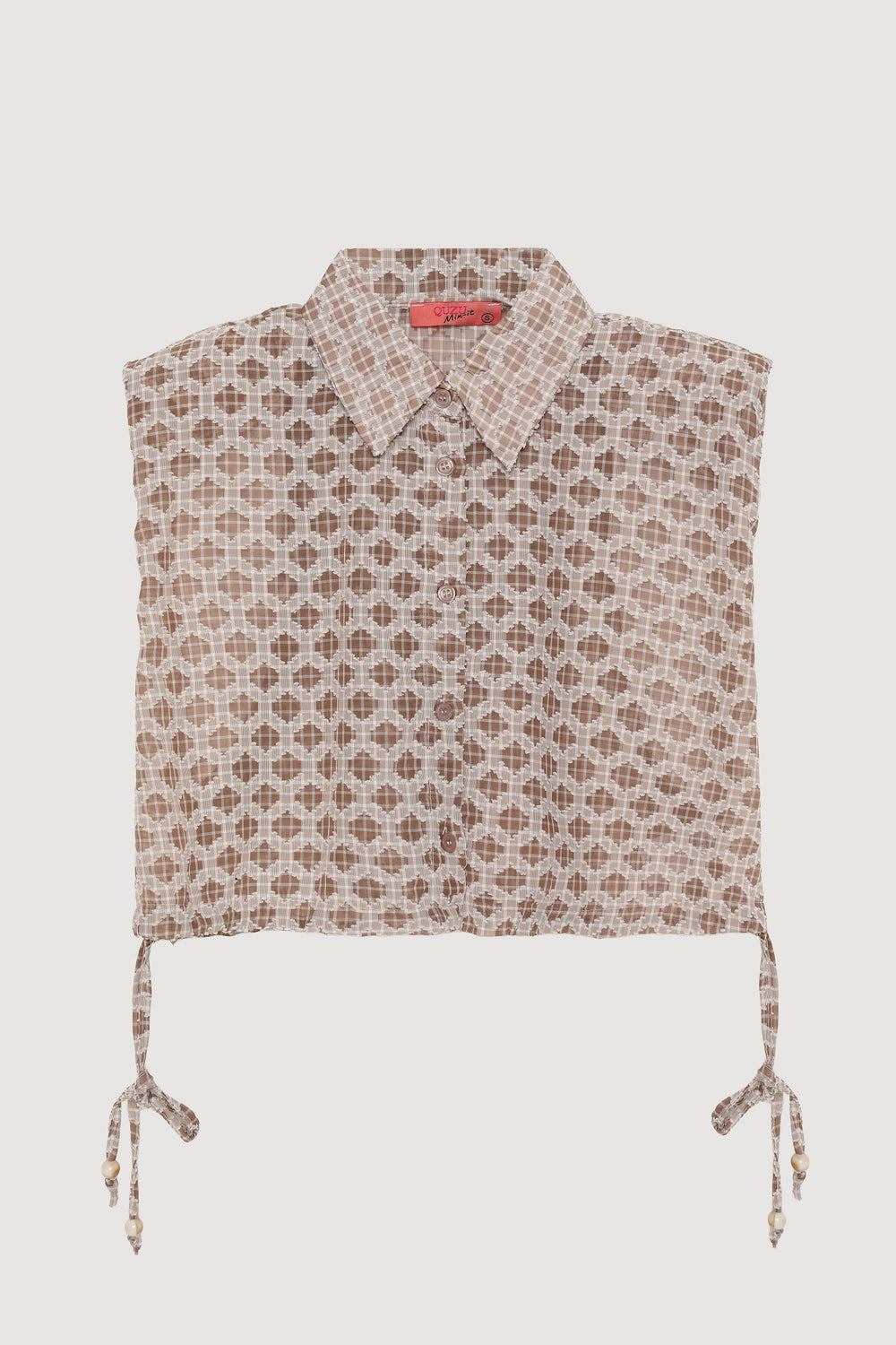 Klasik yaka detaylı, önden düğme kapamalı, hafif ve dokulu kumaş gereği iç gösterebilir, beli ayarlanabilir bağcık uçlarında boncuk süslemeli, omuzları vatkalı, kolsuz crop gömlek.