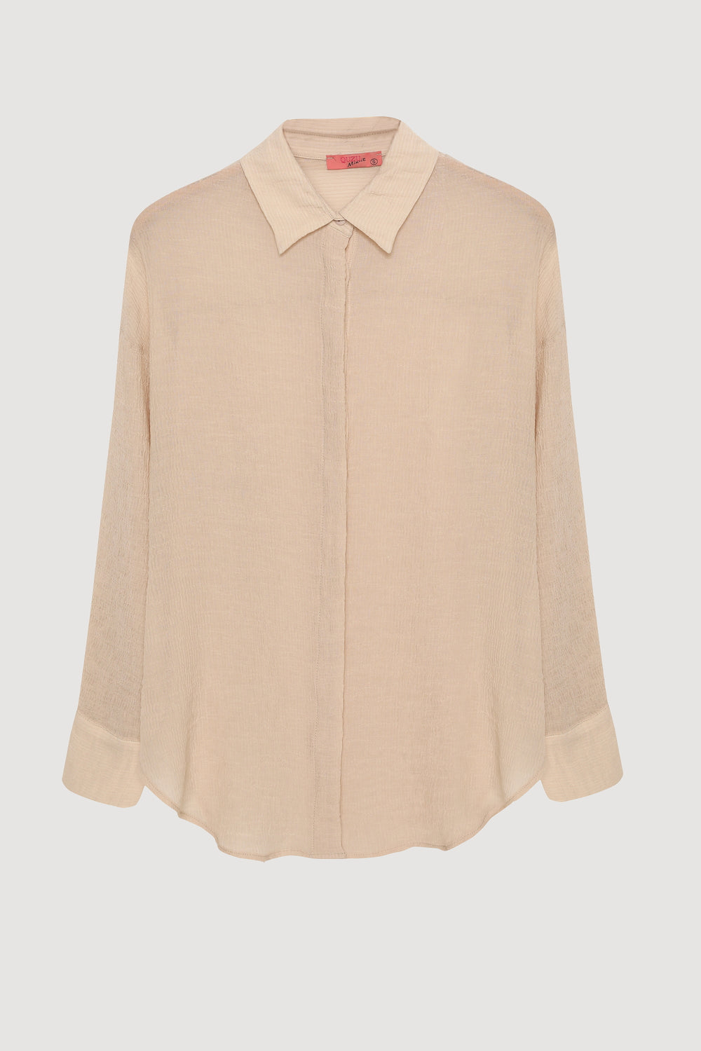 Dökümlü yapıya sahip, uzun kollu, klasik yaka detaylı, önü gizli düğmeli, hafif ve ince dokulu kumaşı nedeniyle iç gösterebilir, oversize gömlek.