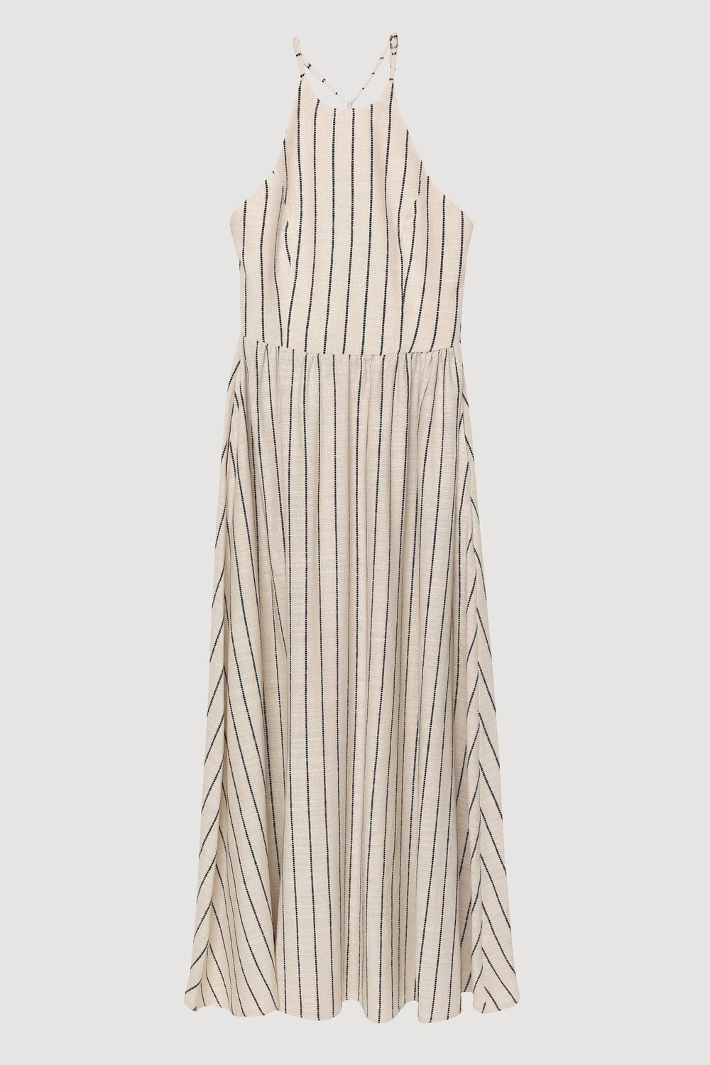 Halter Yaka Keten Sırtı Bağlamalı Çizgili Uzun Elbise Naturel