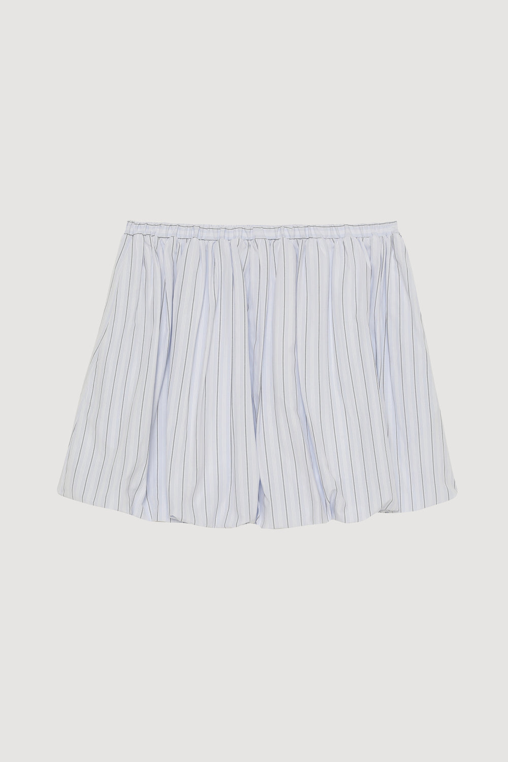 Beli lastikli, içi astarlı, dikey ince çizgili desenli, balon formlu, modern ve sportif görünümlü mini boy etek.