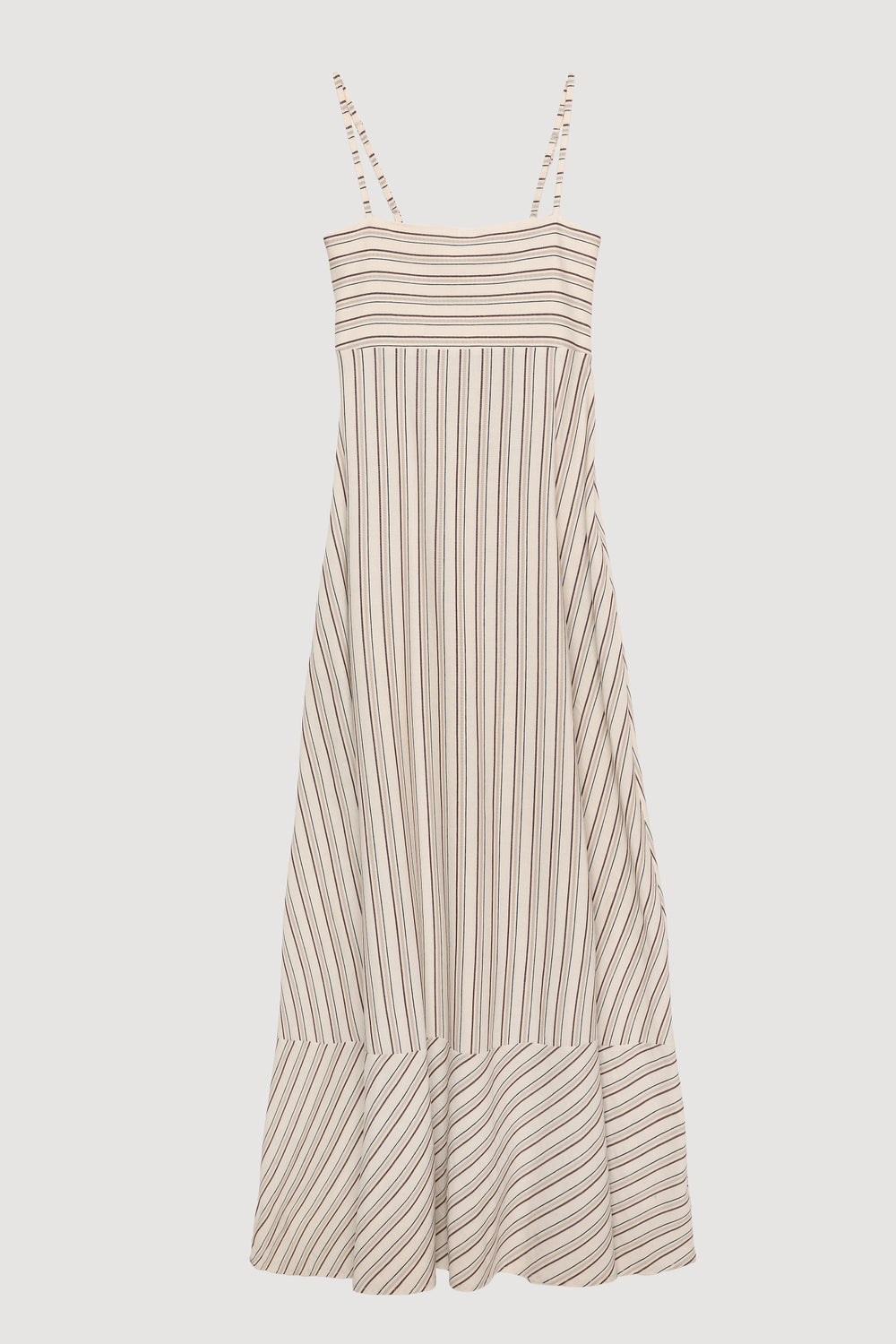 İnce Çizgili Etek Ucu Volanlı Askılı Uzun Elbise Naturel