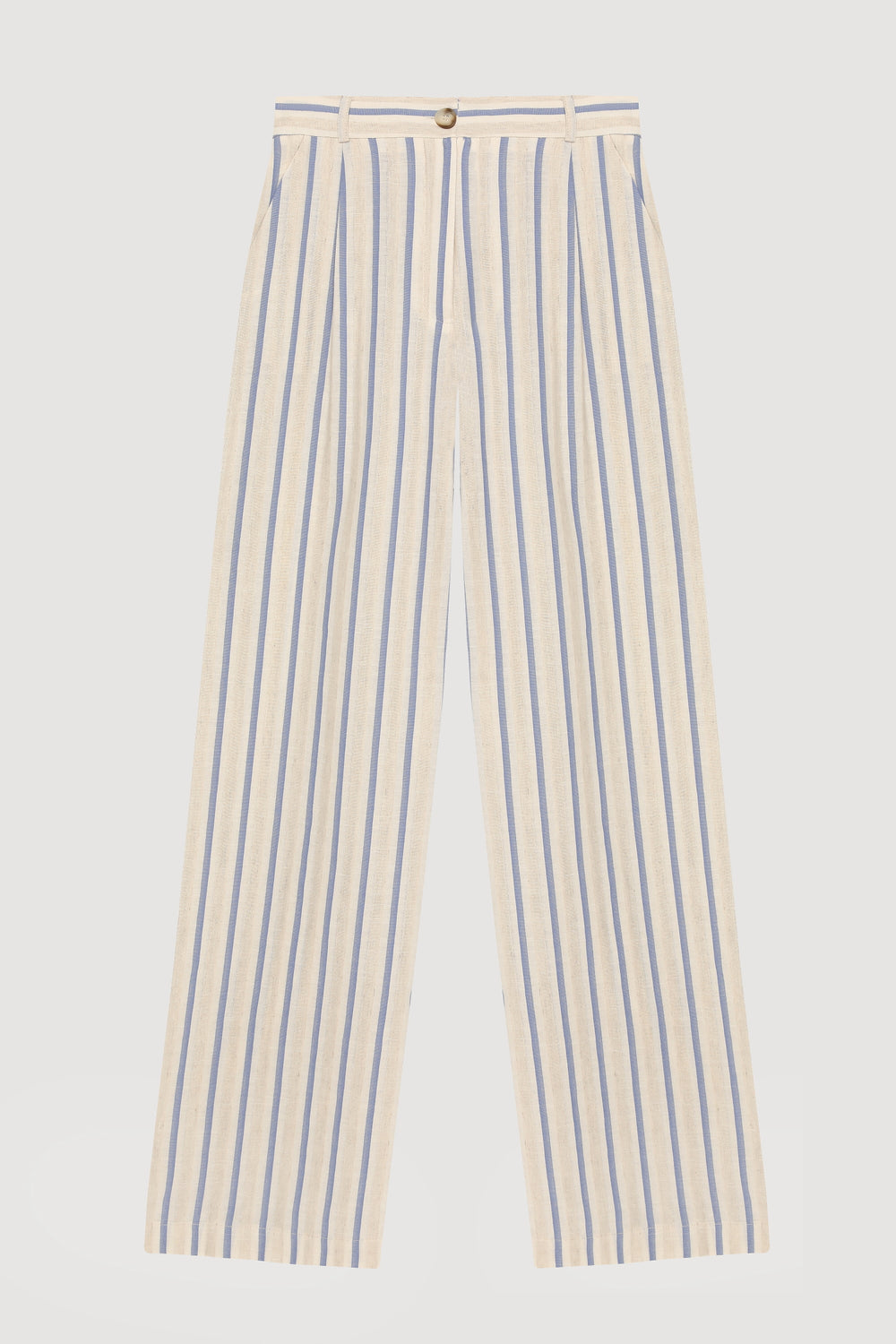 Yüksek bel, fermuarlı ve düğme kapamalı, çift cepli, kalın çizgi desenli, arkası cep görünümlü, etiket yazı detaylı, düz kesim uzun paça pantolon.