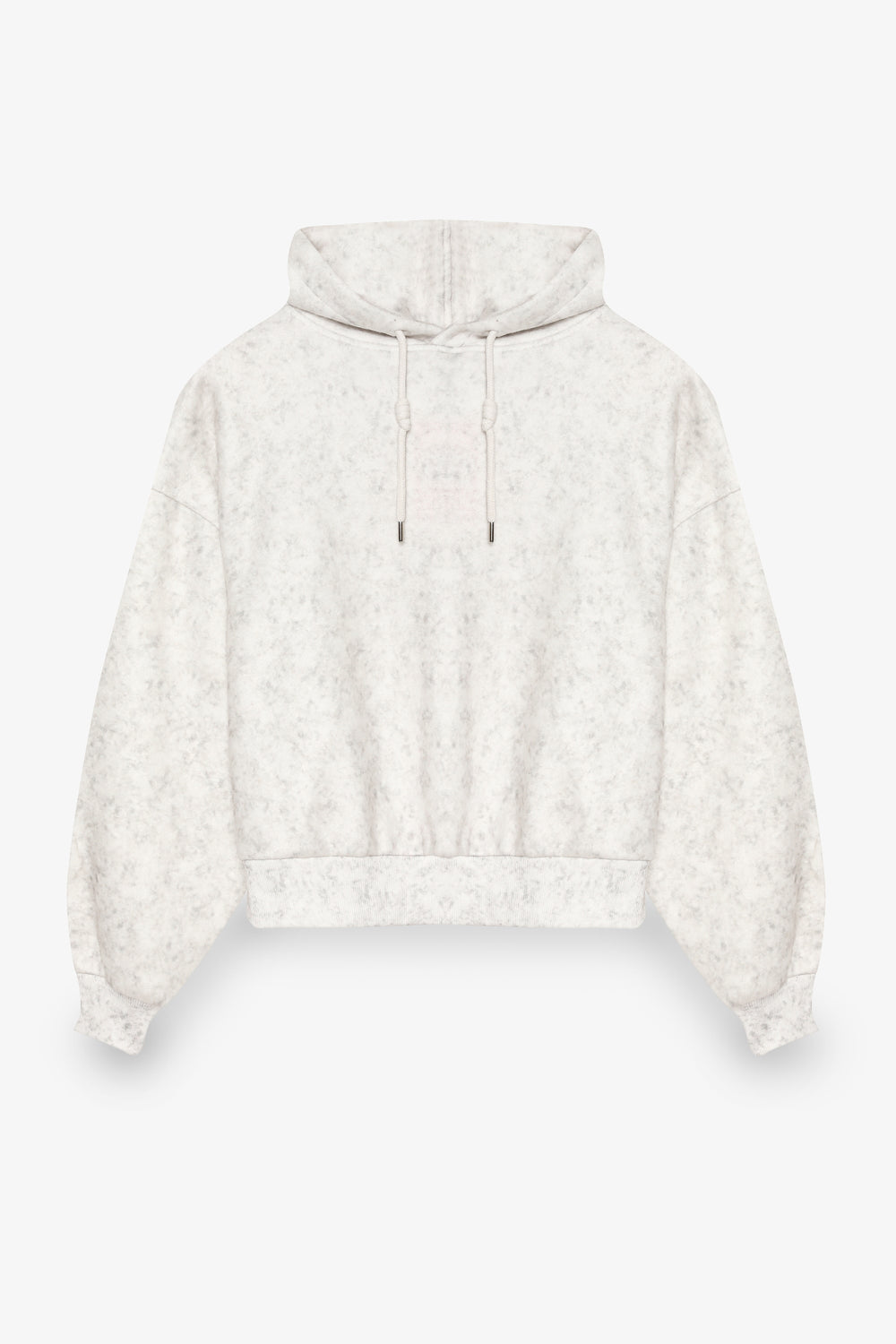 Kapüşonlu, uzun kollu, lastikli etek ucu ve manşet detaylı, şardonsuz, yıkama efektli, yumuşak dokulu hafif tüy kumaşlı, oversize sweatshirt.
