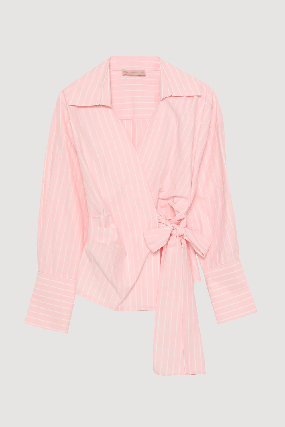 Gömlek yaka detaylı, yandan kuşak bağlamalı, kruvaze, uzun kollu,yandan drape detaylı, manşetli, çizgili bluz.