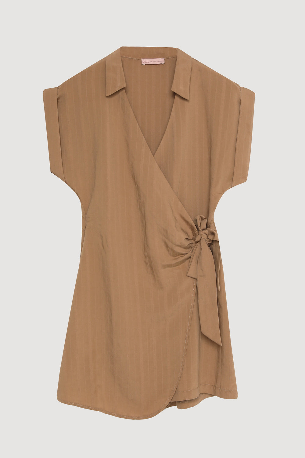 Çizgili ince dokulu kumaştan, astarsız, kısa kollu, kruvaze yakalı, yan kuşak bağlama detaylı, içten yandan fermuar kapamalı, şort tulum.