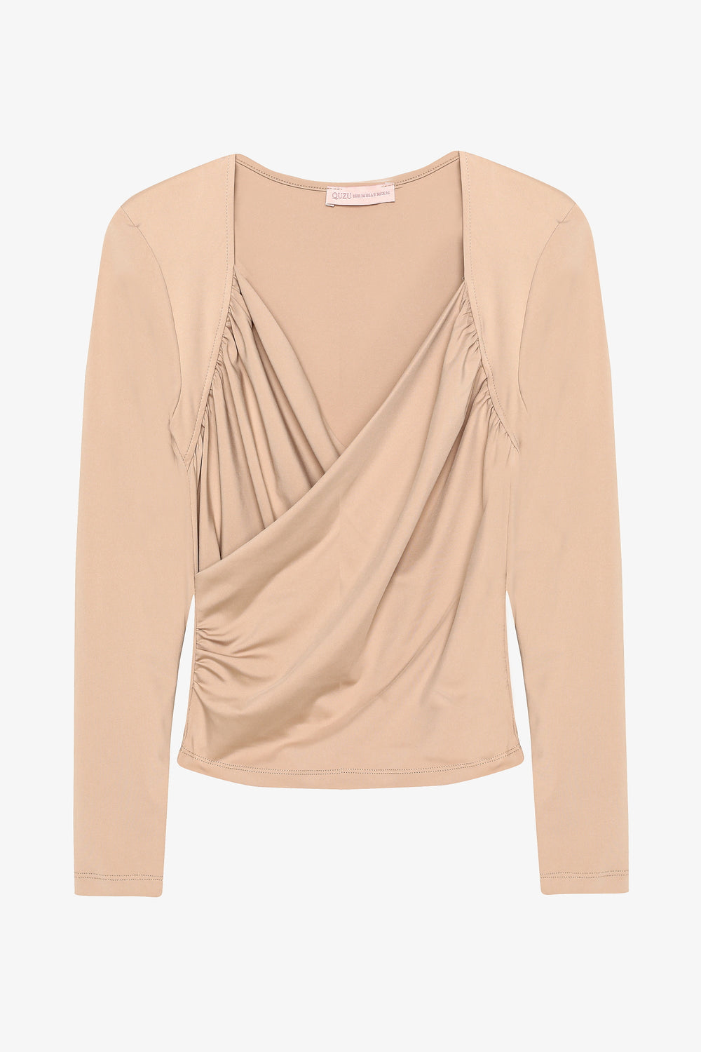 Kruvaze Yaka Drapeli Uzun Kollu Bluz Bej