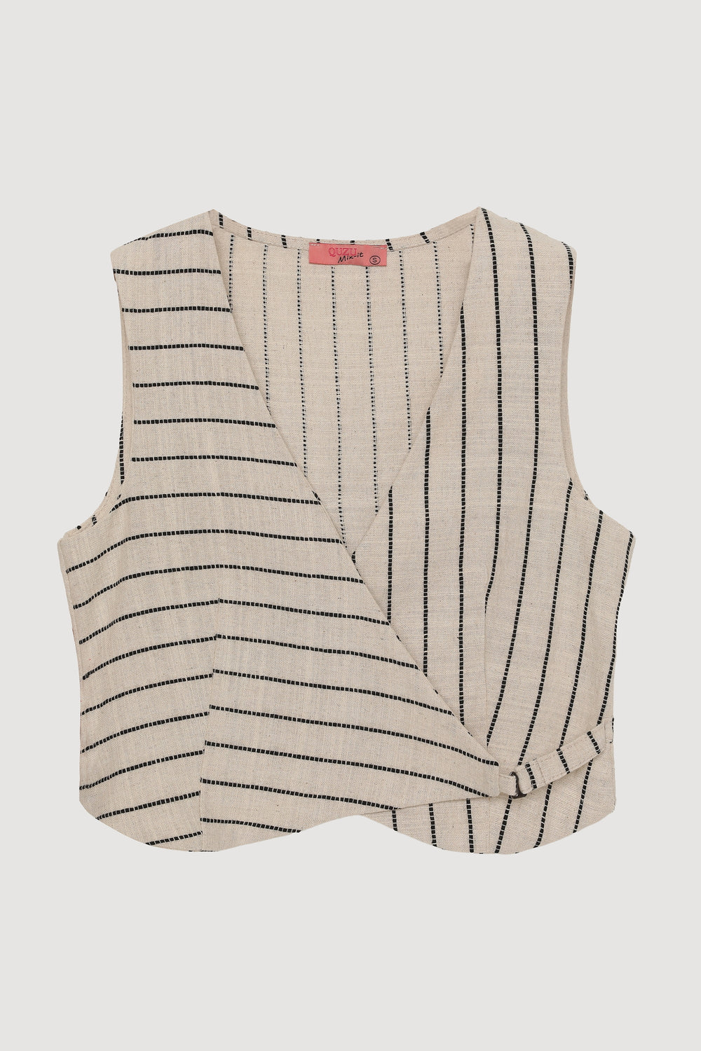 İnce çizgi desenli, içi astarsız, v yaka, kruvaze kesim, kolsuz, crop boy, yandan ve içten kanca geçirmeli bluz.