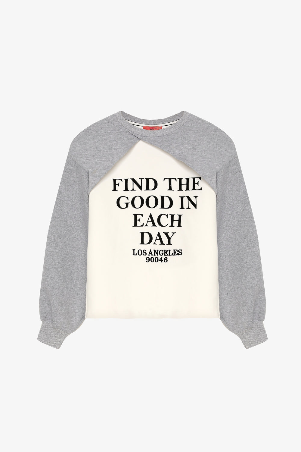 Match Detaylı Yazı Baskılı Bisiklet Yaka Sweatshirt Gri