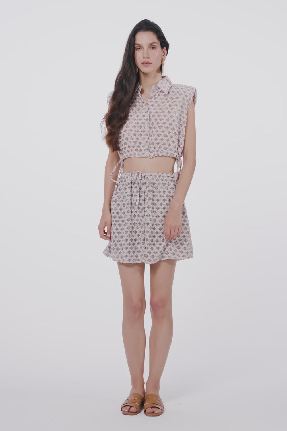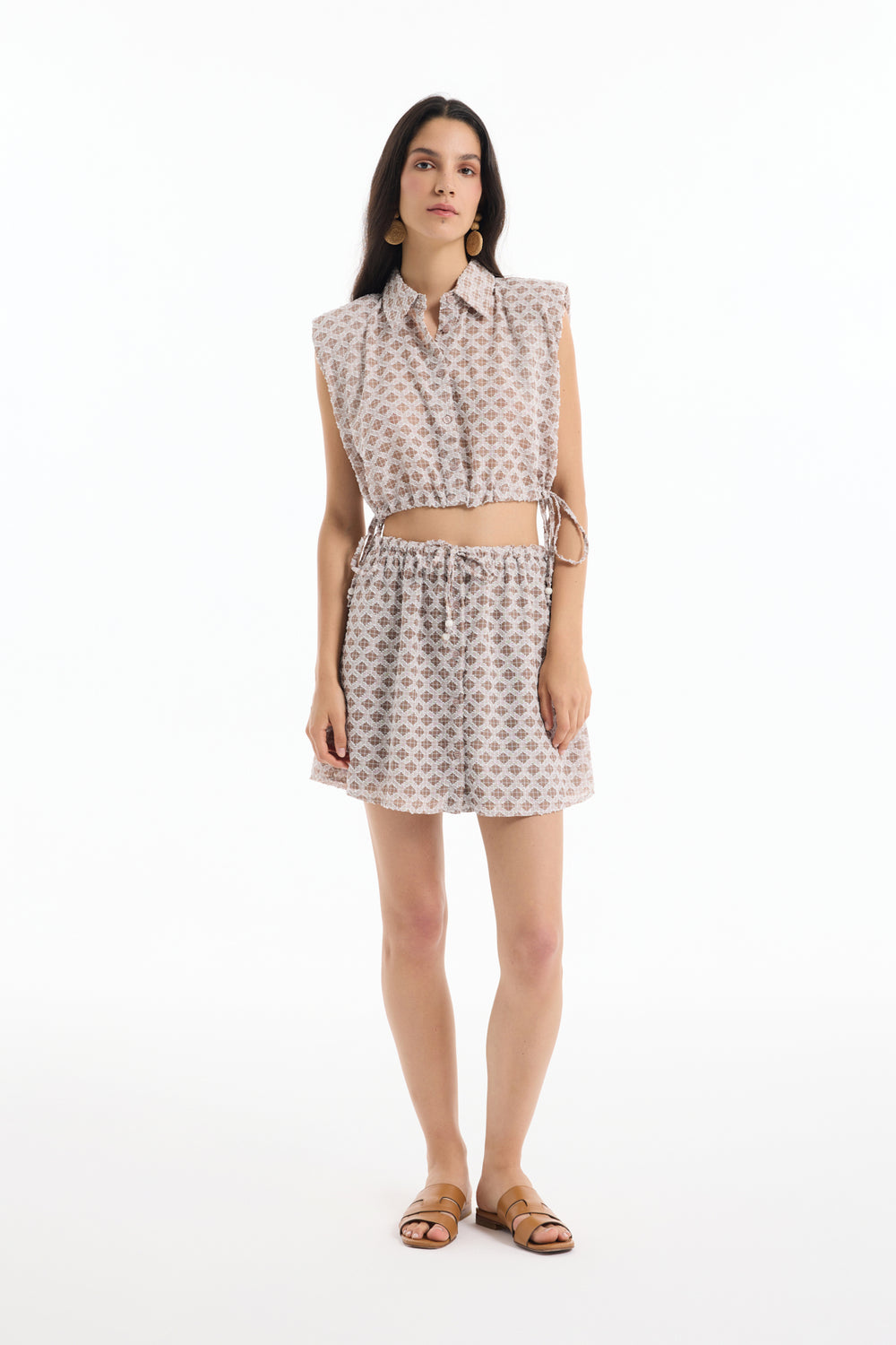 İçi kendi renginden astarlı, önden düğme kapamalı, dokulu kumaş, beli lastikli, bağcık bağlamalı uçları boncuk süslemeli, mini boy etek.