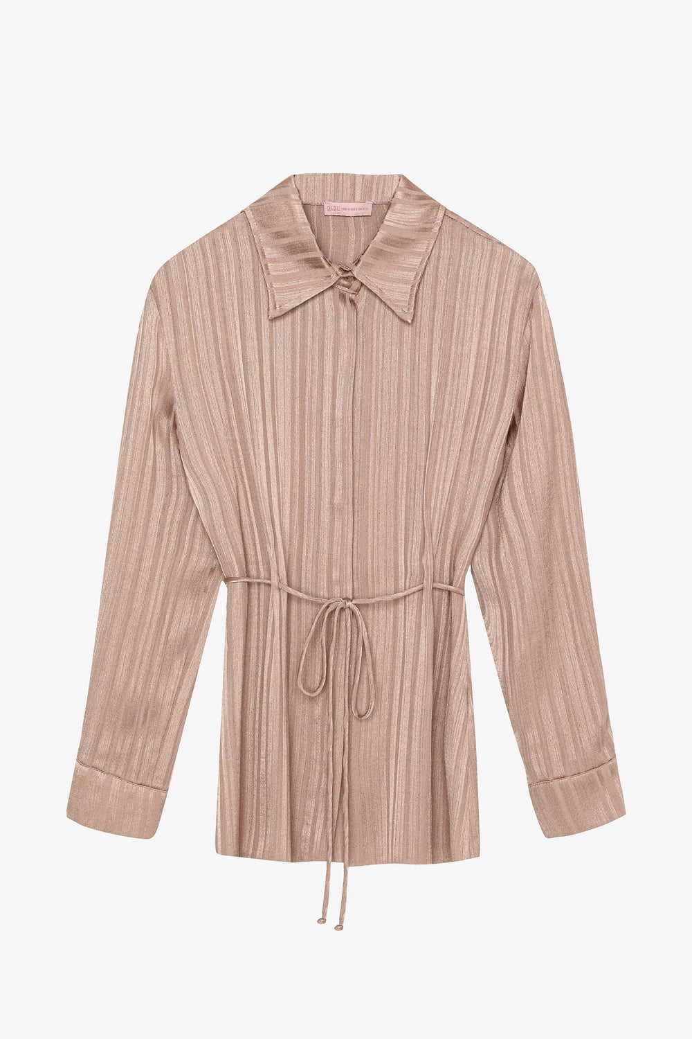 Parlak Dokulu Çizgili Belden Bağlamalı Gömlek Vizon