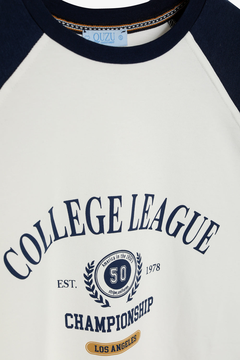Reglan kol detaylı, bisiklet yaka, ön kısmı yazı baskılı, şardonsuz, iki renk blok tasarımlı, uzun kollu, ince sweatshirt.