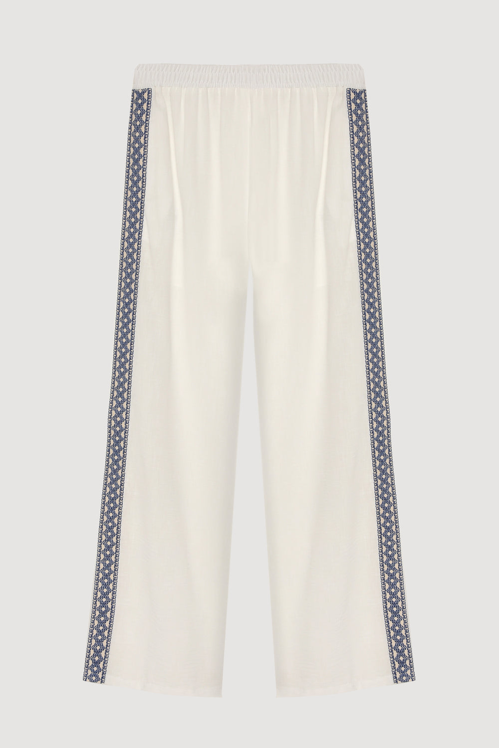 Şerit Nakışlı Beli Lastikli Bol Paça Pantolon Ekru
