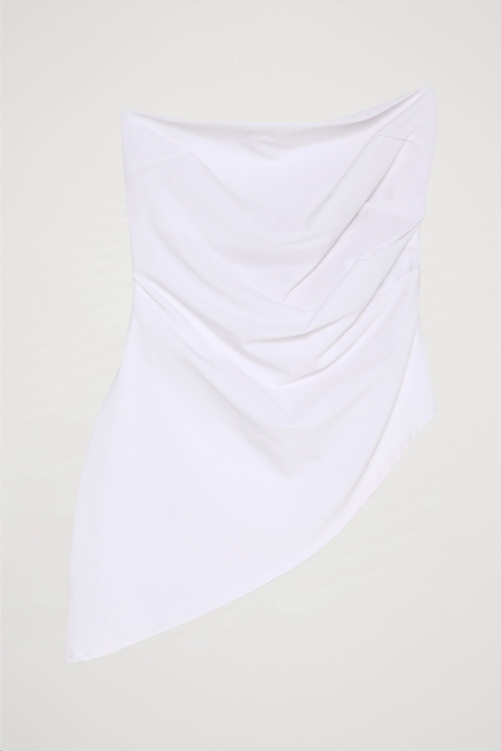 Asimetrik kesimli, yandan fermuar kapamalı, sırtı lastikli, straplez yaka, iç astarsız, drape detaylı, modern ve şık bluz.