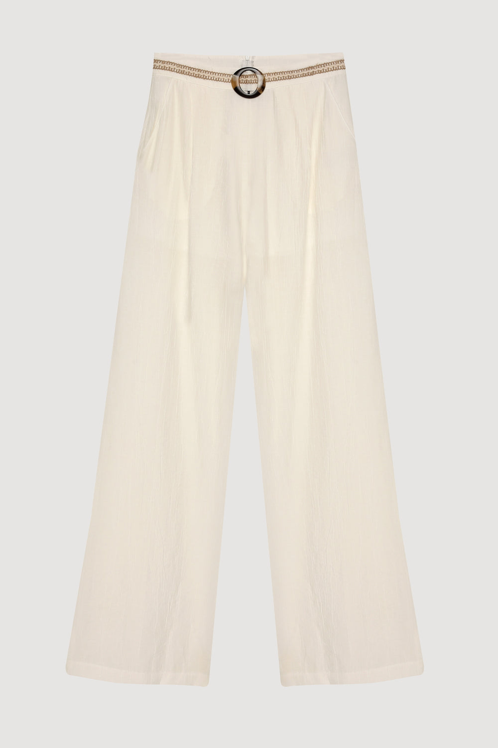 Toka Aksesuarlı Beli Nakışlı Bol Paça Pantolon Ekru
