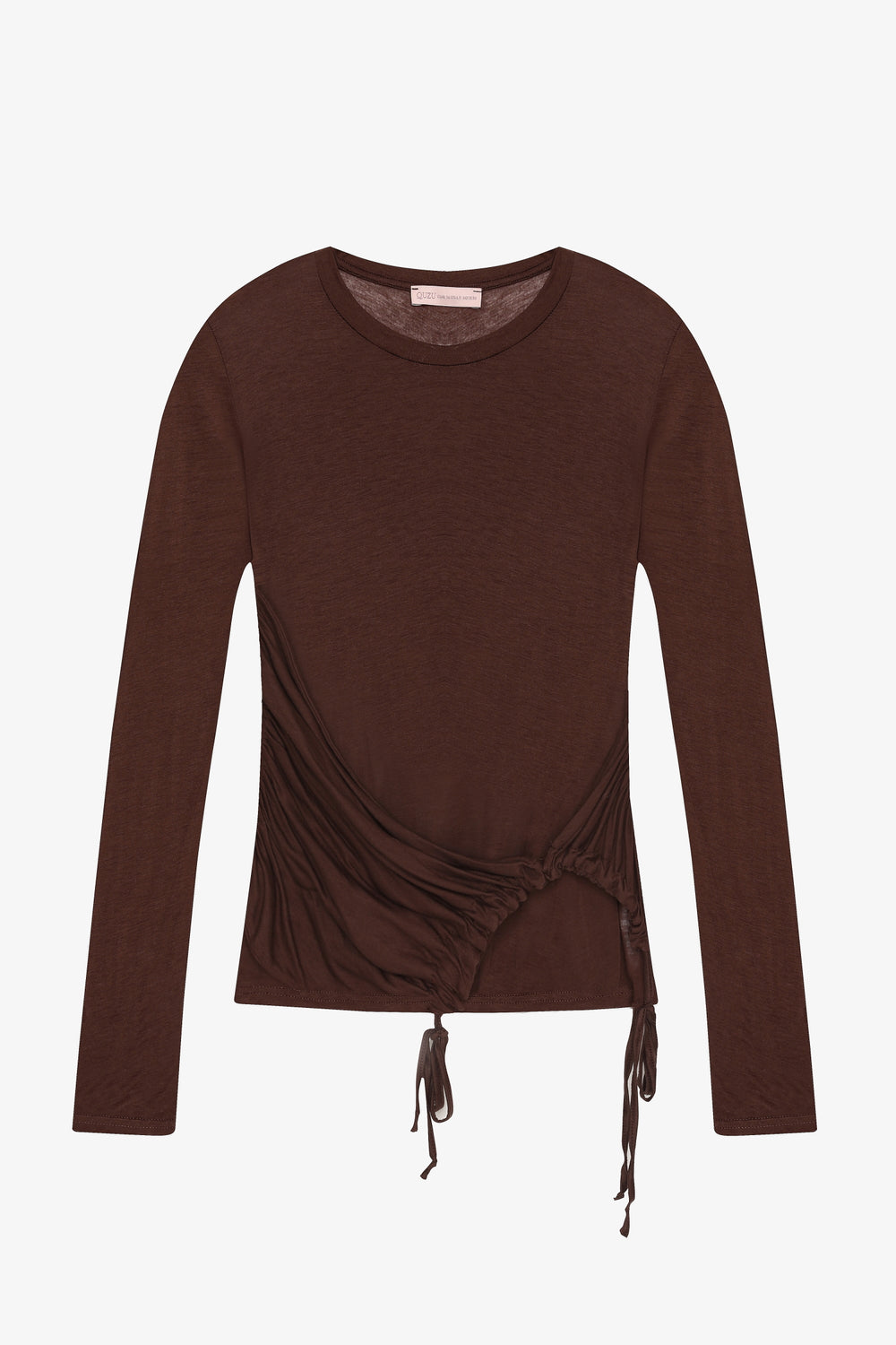 Yuvarlak yaka, uzun kollu, yan kısmı büzgülü bağcık detaylı, modern görünüm sunan ince transparan kumaştan bluz.