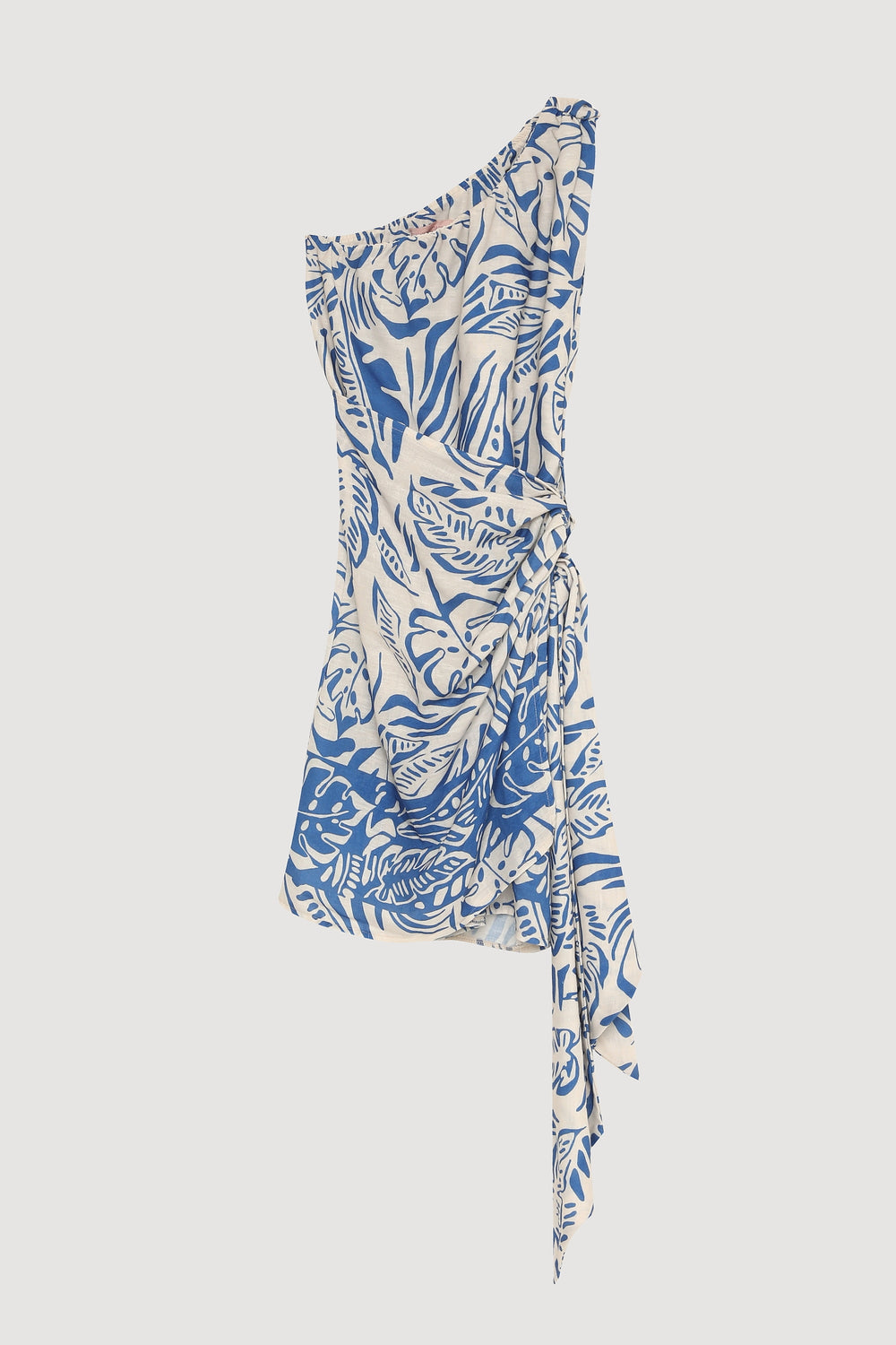 Yaprak Desenli Tek Omuz Büzgülü Elbise Mavi