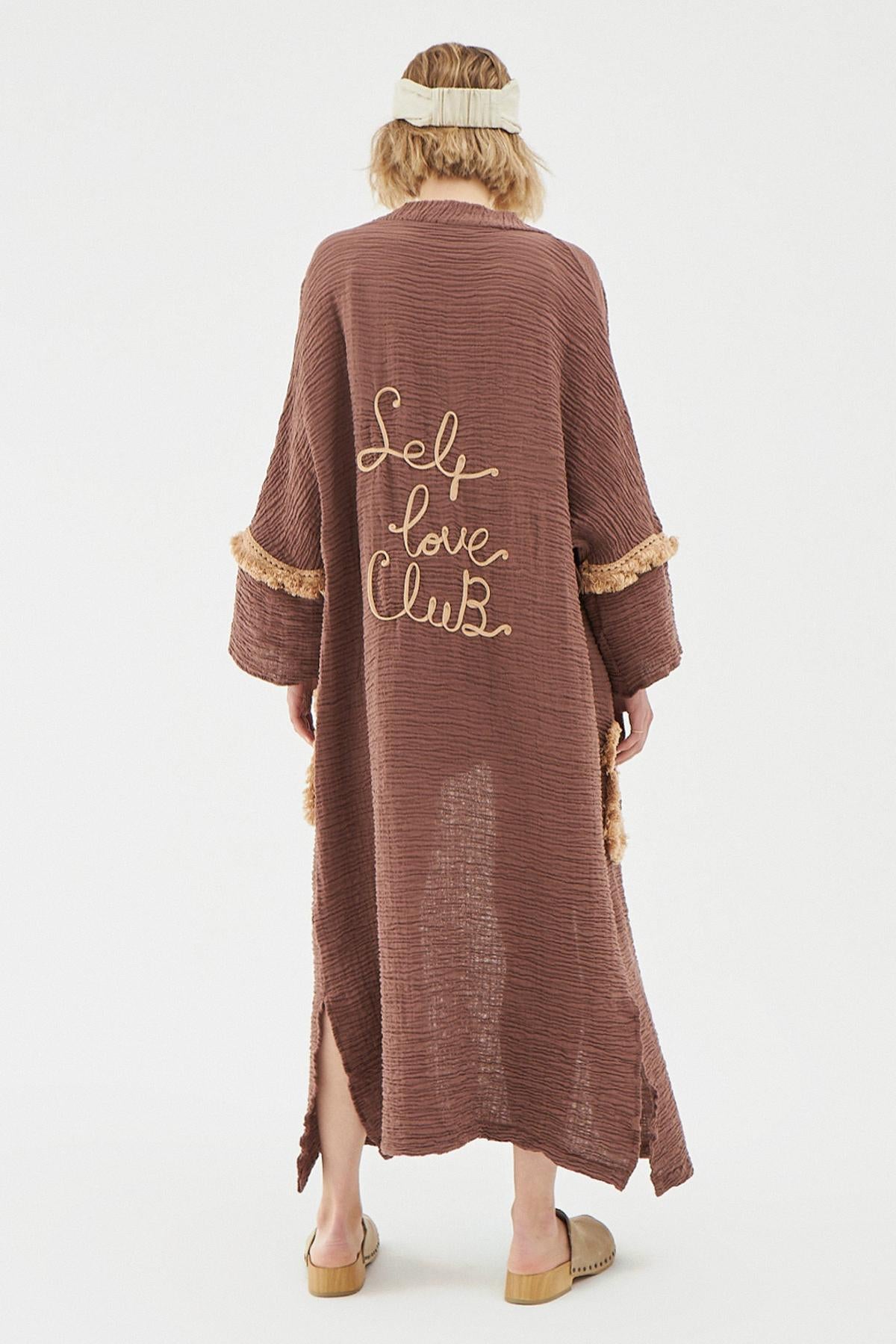 Nakışlı Püsküllü Uzun Kimono Kahverengi