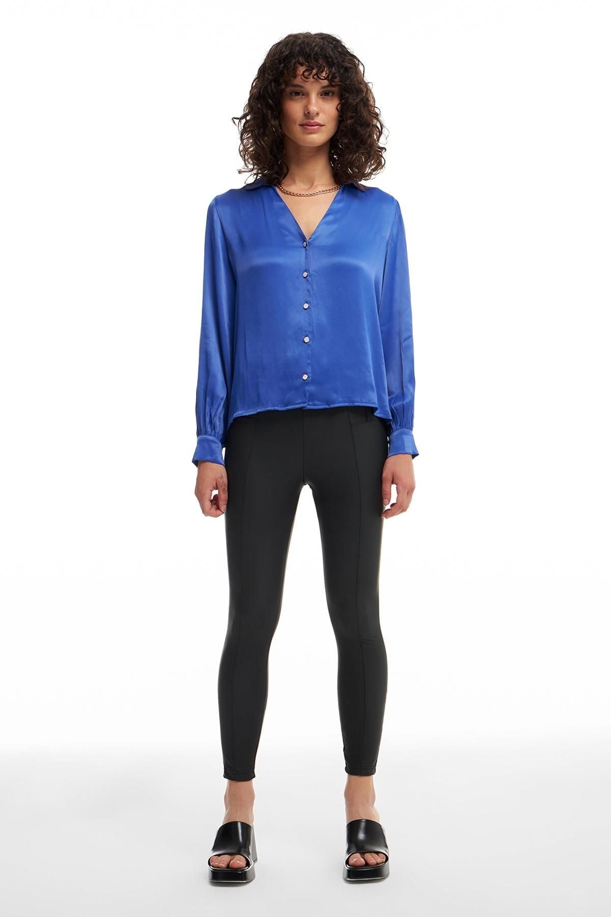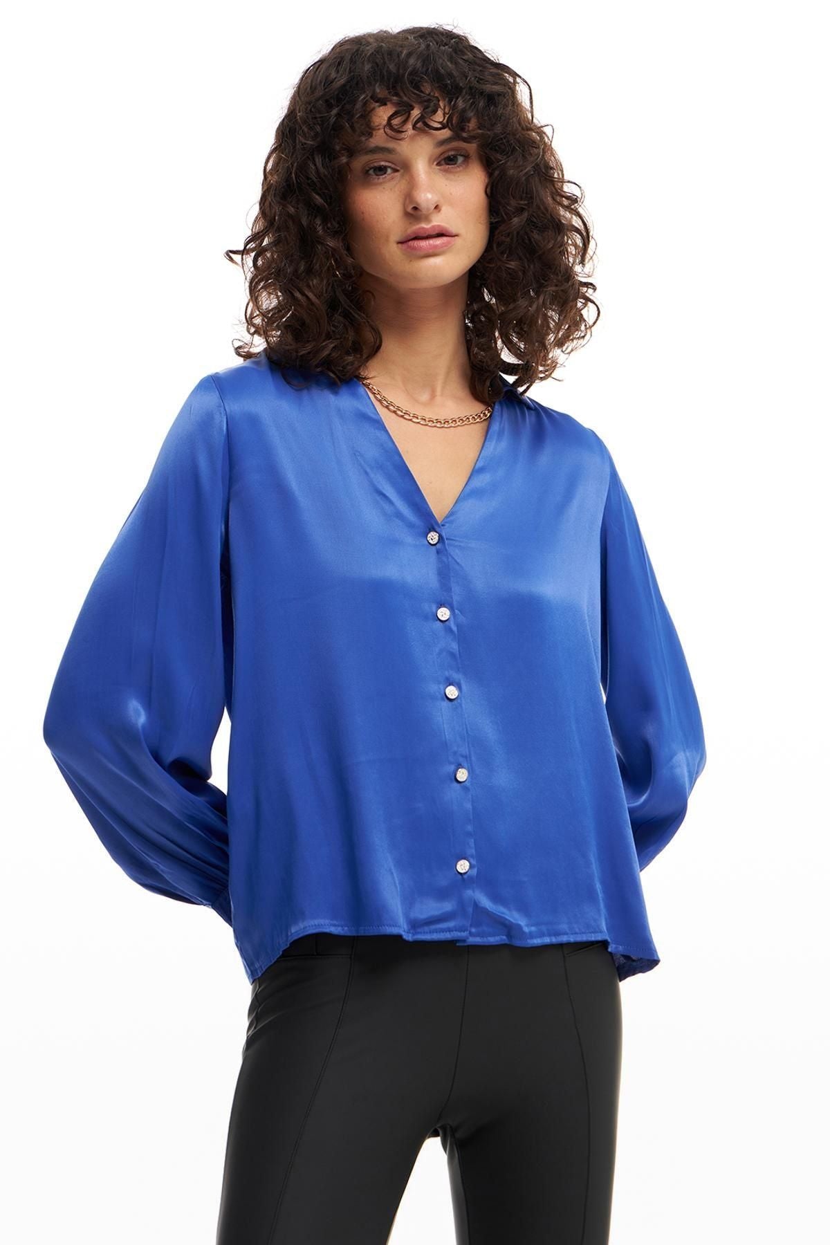 Uzun kollu, saten parlak doku, geniş kesim, düğmeli, %100 viskon içerikli gömlek.