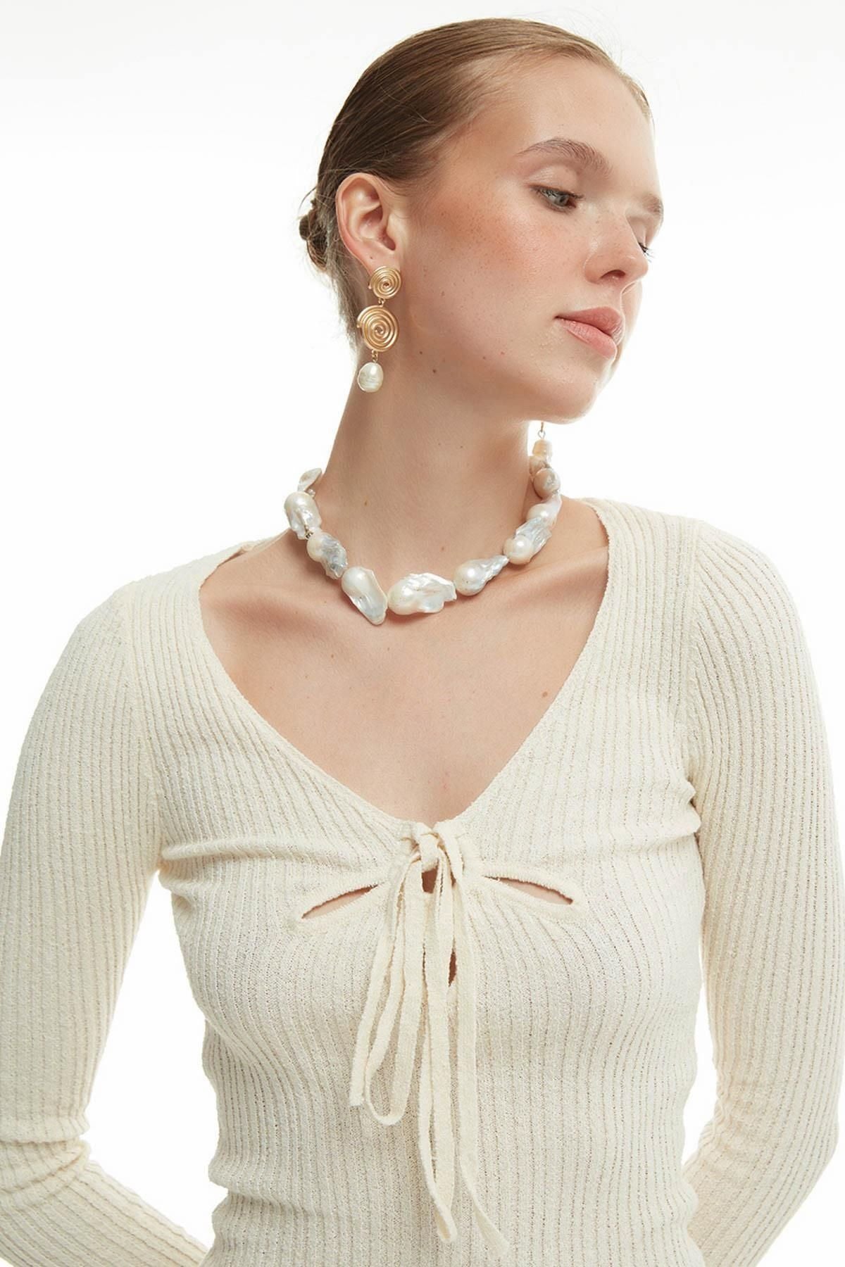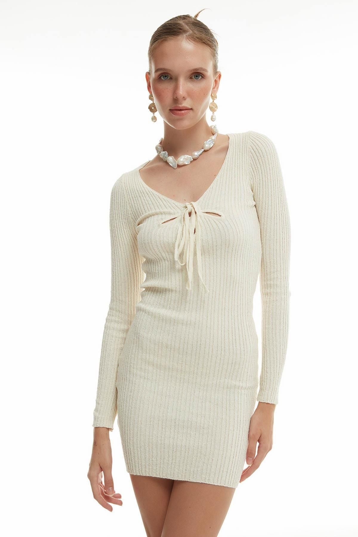 Göğüs Detaylı Triko Elbise Ekru
