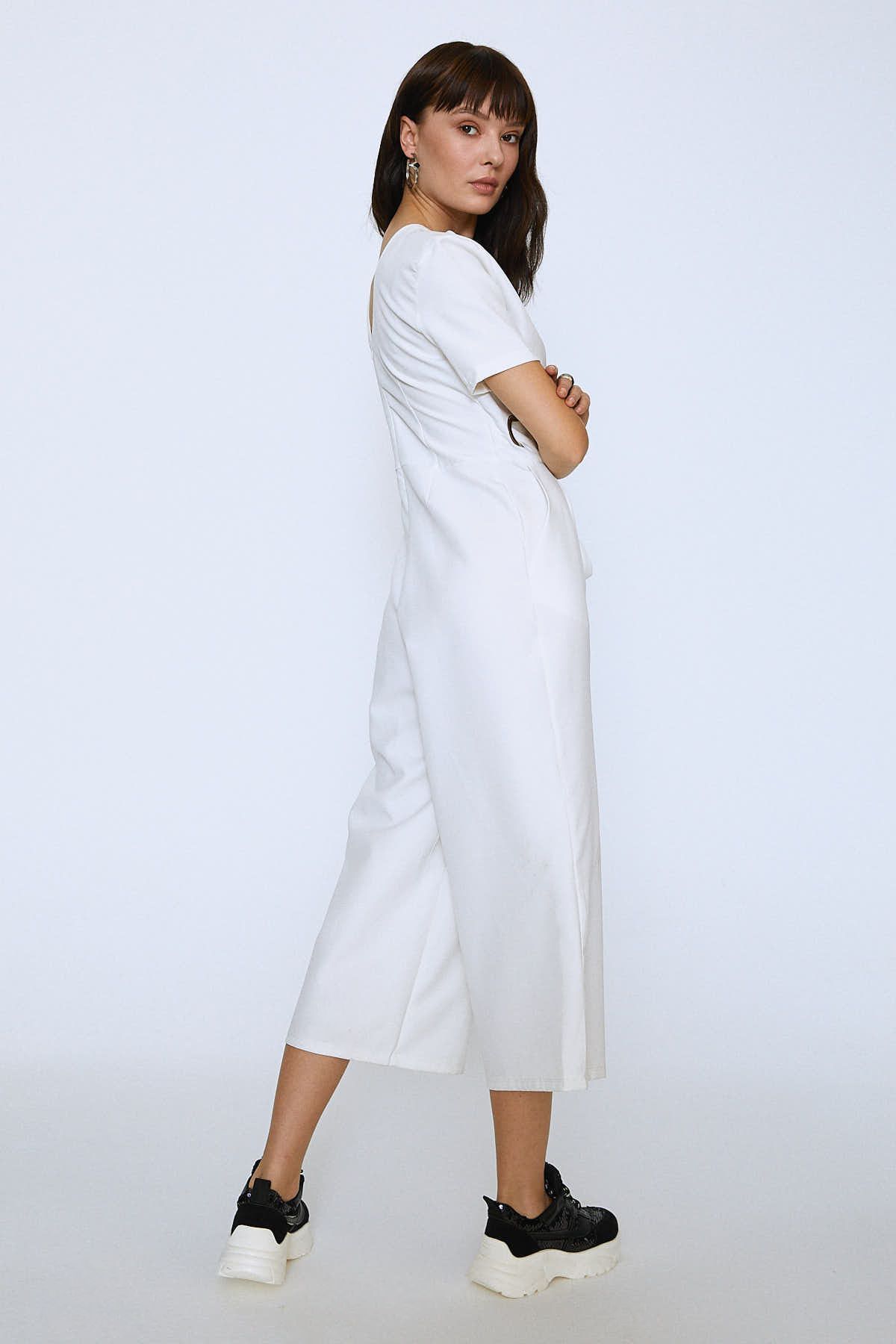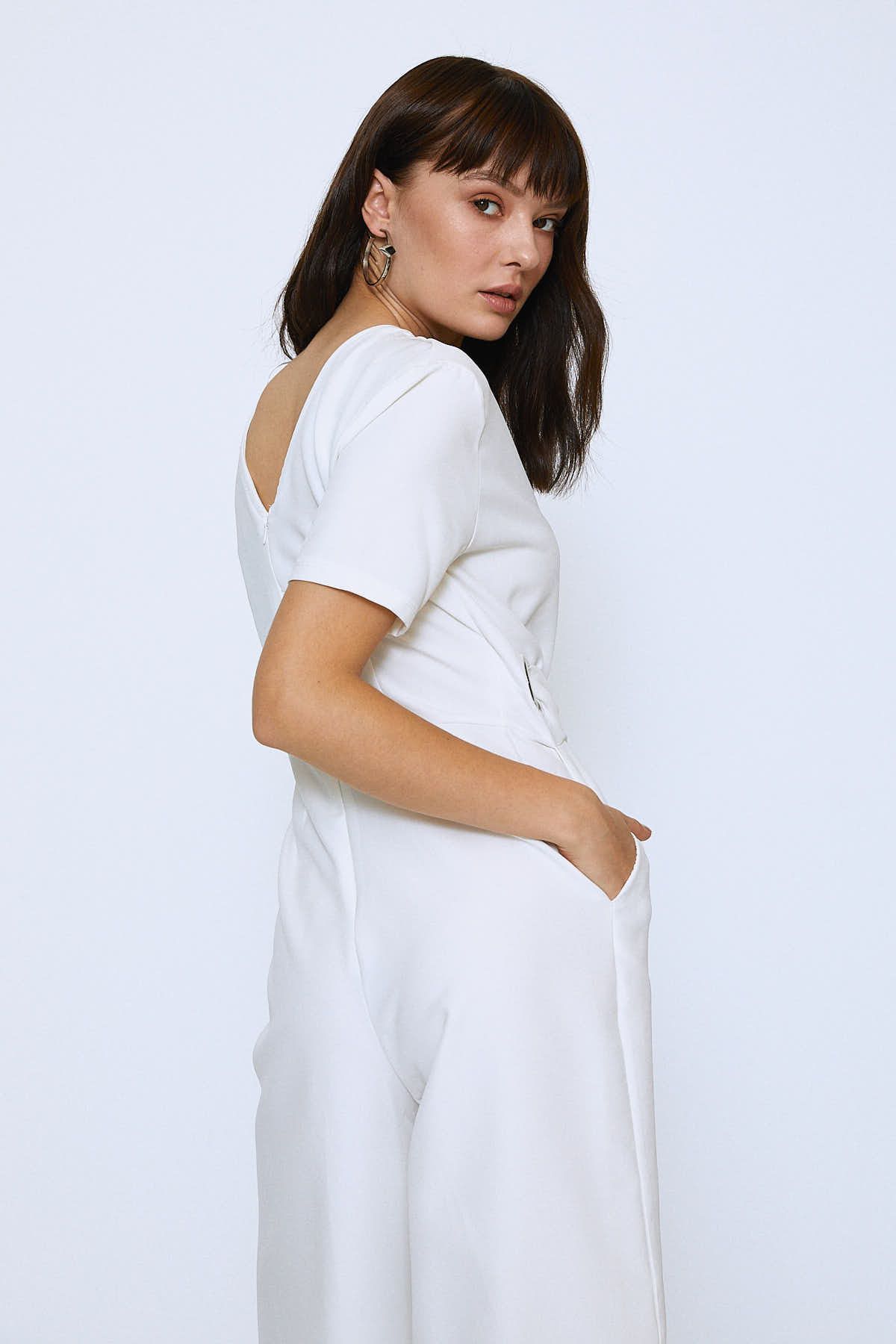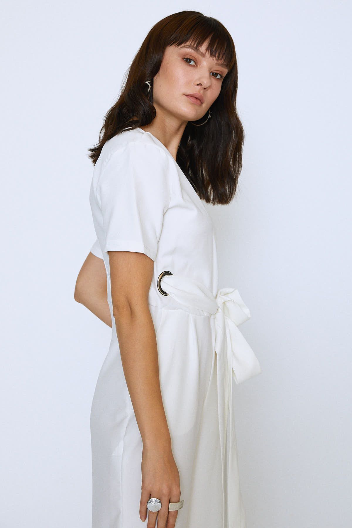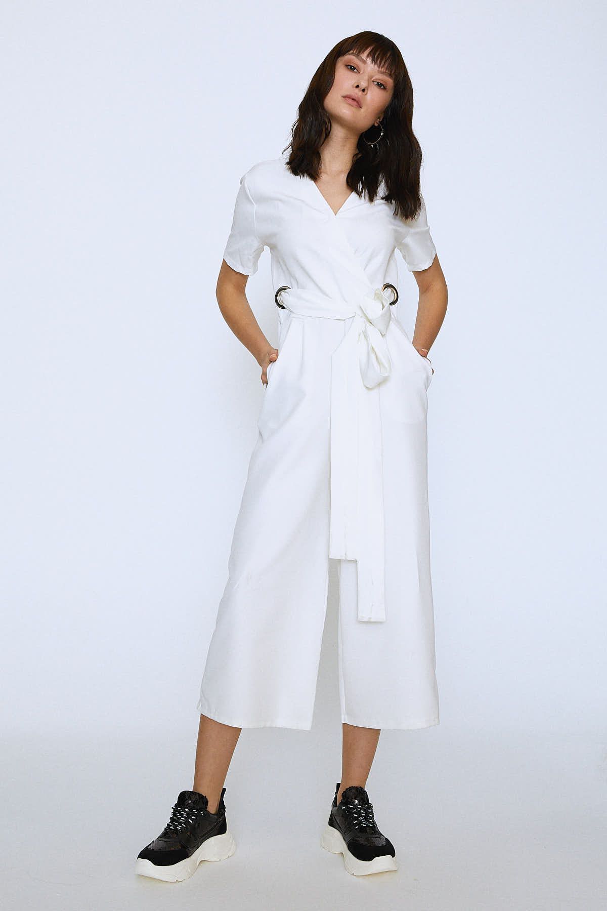 Seni gündüzden geceye taşıyacak toka detaylı kemerli kruvaze tulum kusursuz bir görünüm yaratmaya yardımcı.