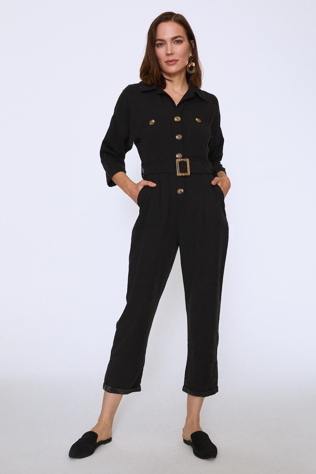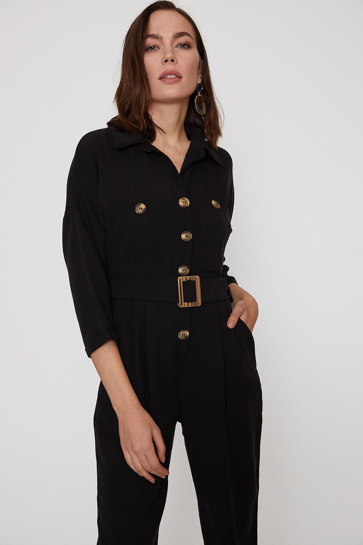 Modern stilin öncülerinden olan tulum, belinde kullanılan kuşağı ile zenginleştiriliyor. V yakası ve bilek üstü pantolon boyu ile dikkatleri üzerine çeken tulumu, sandalet ve terliklerle tamamlayabilirsin.