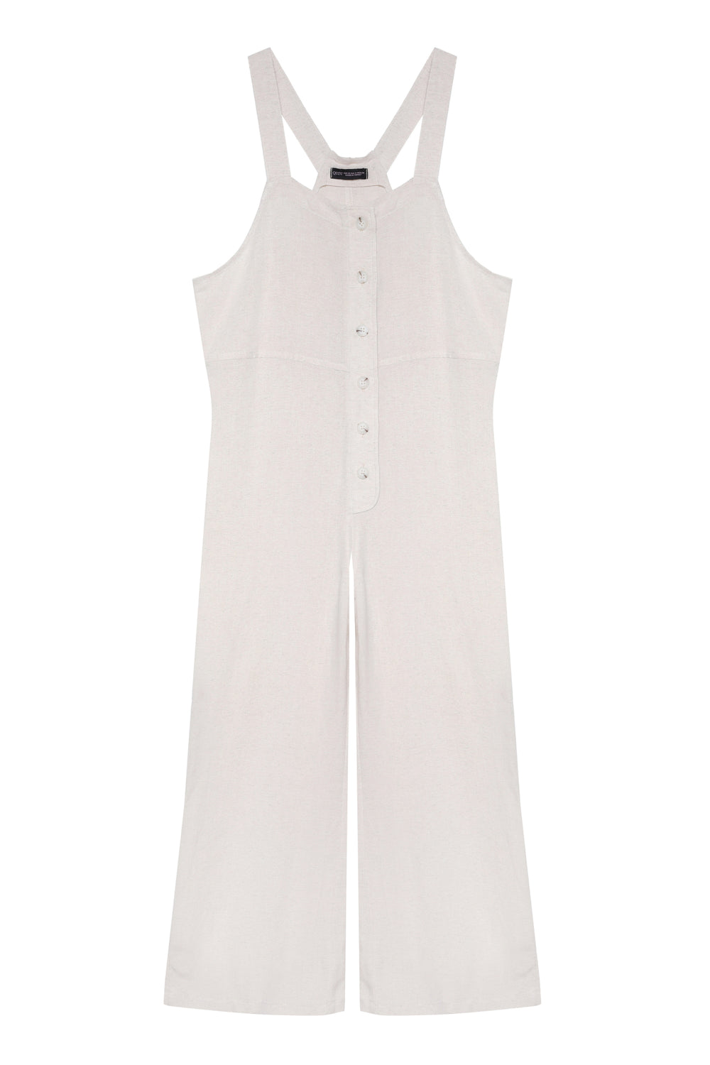 Keten karışımlı, düğme detaylı, kalın askılı, geniş paçalı, uzun tulum.