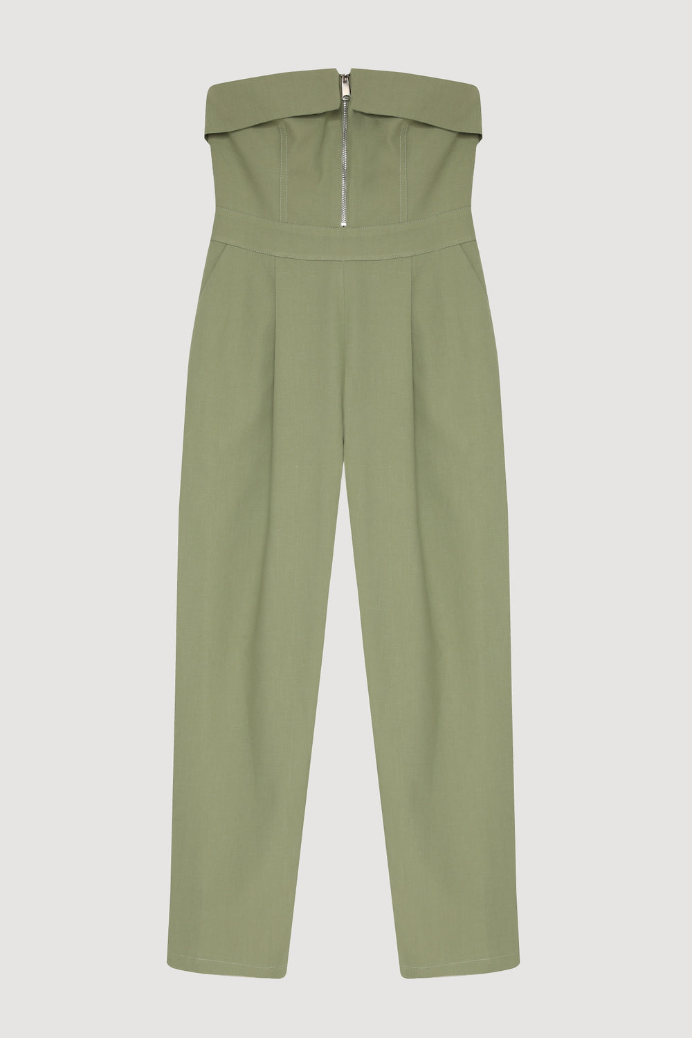 Fermuar Detaylı Straplez Uzun Tulum Haki