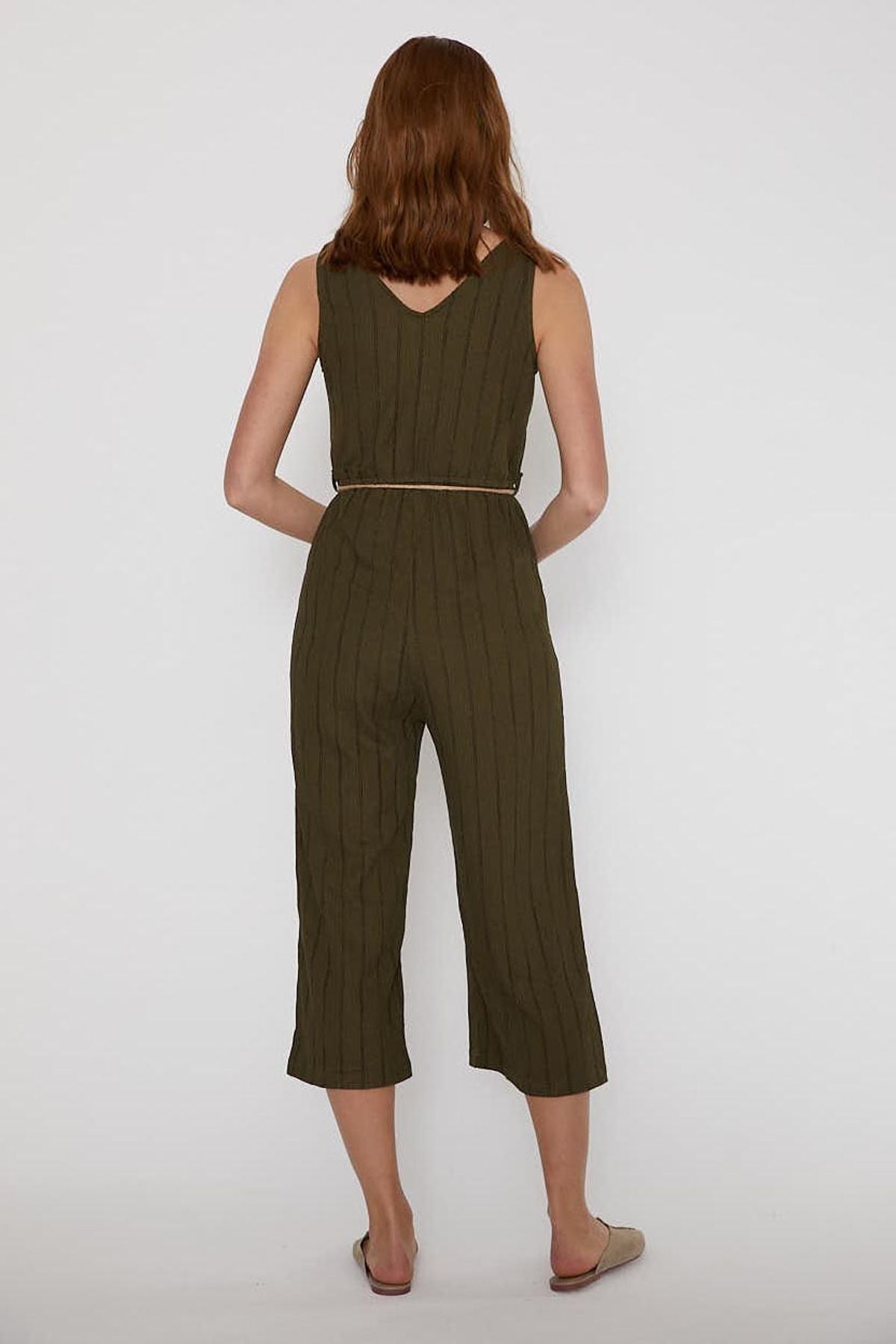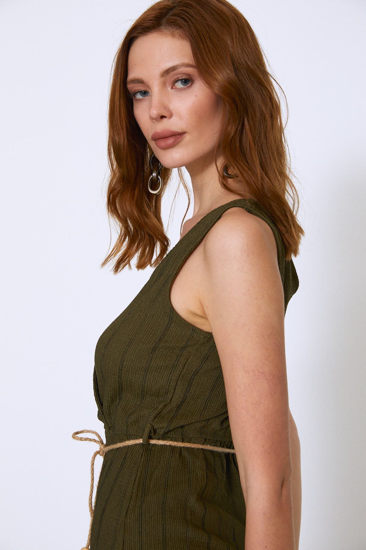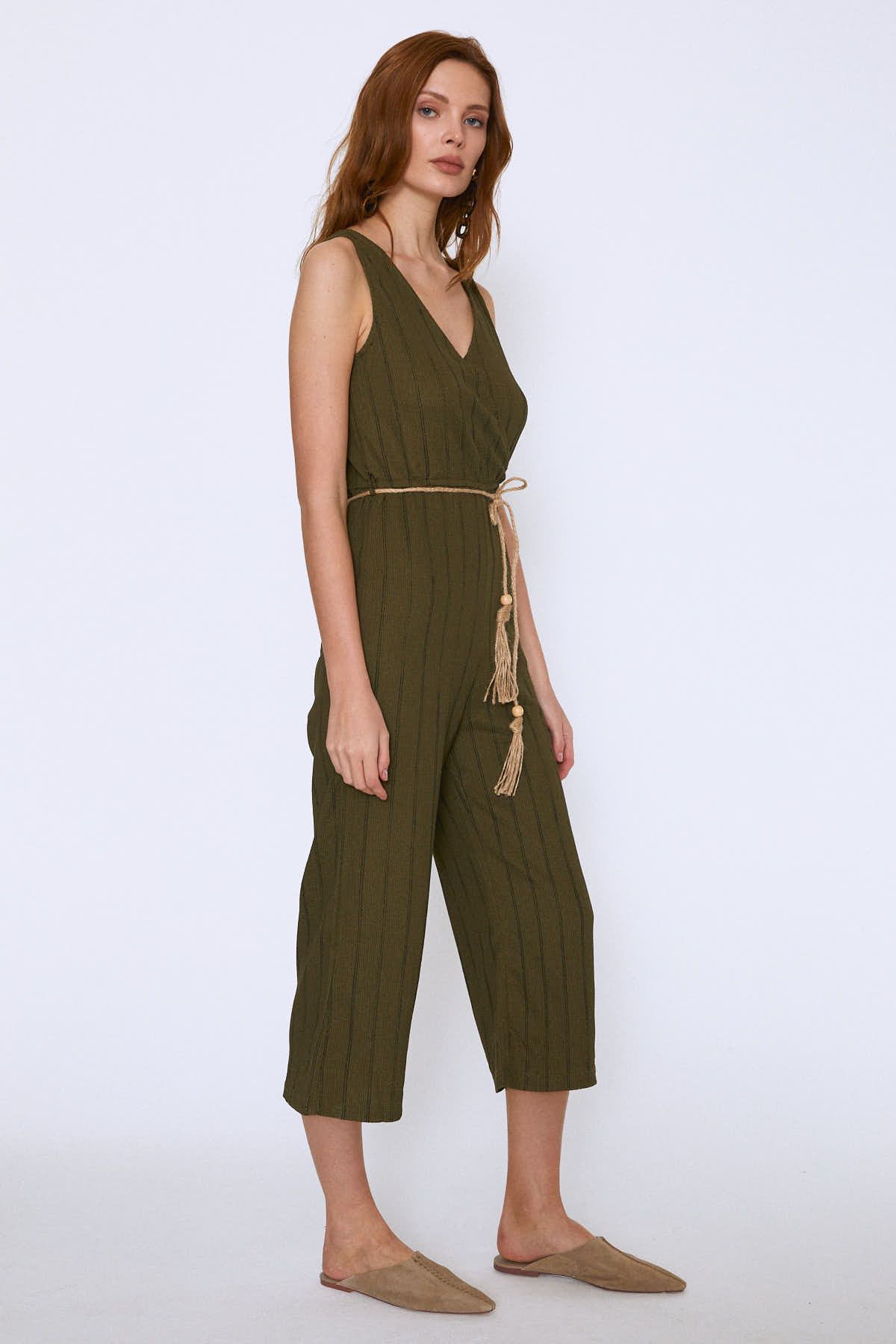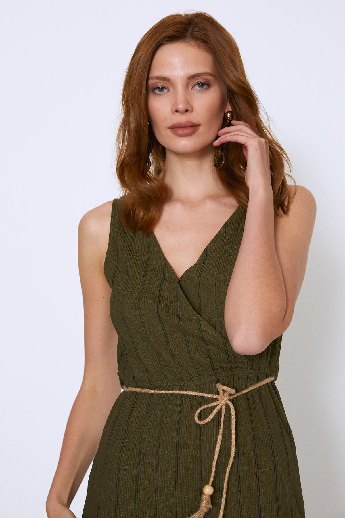 Tulum şıklığının, kaliteli kumaş seçimiyle desteklendiği hasır kemerli v yaka tulum, sezonun en tercih edilen parçaları arasında yerini alacak.