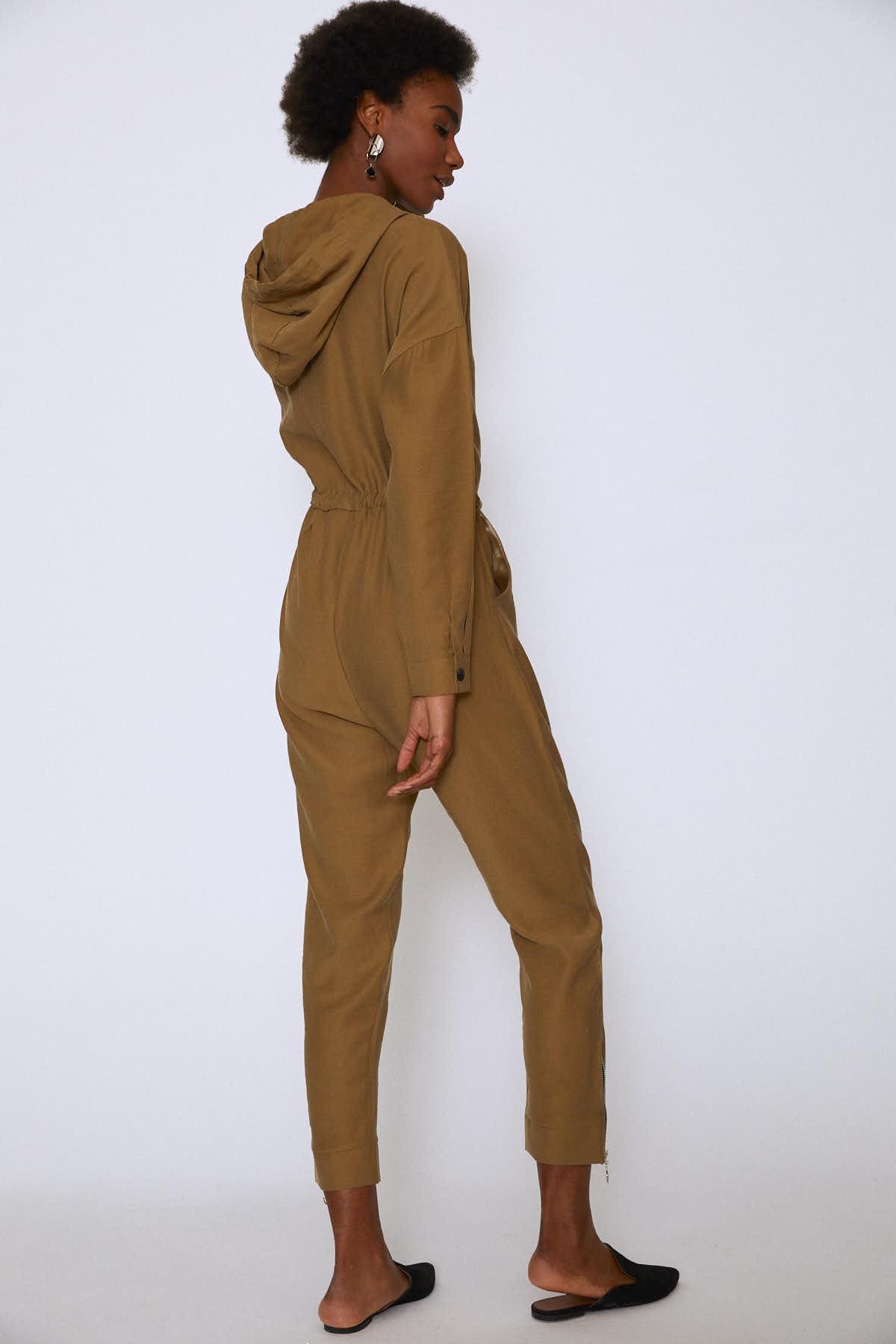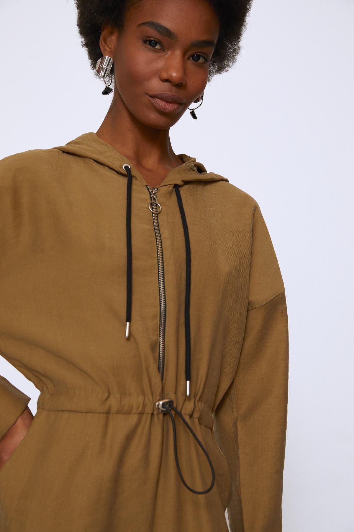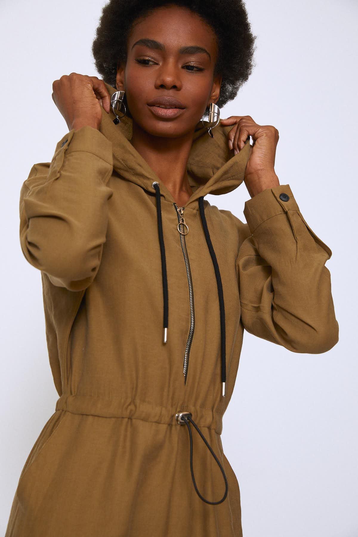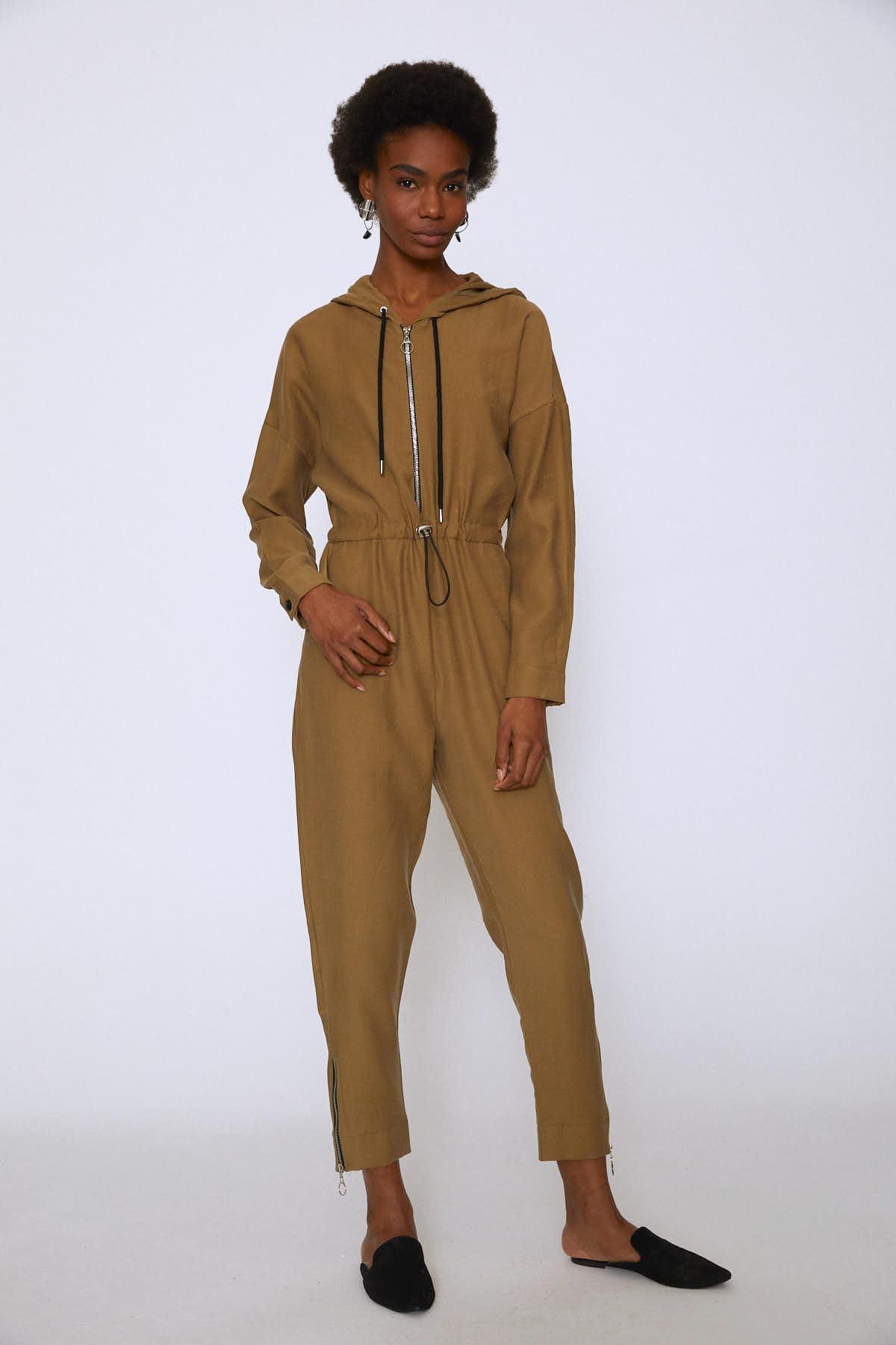 Önü Fermuarlı Kapüşonlu Tulum Haki