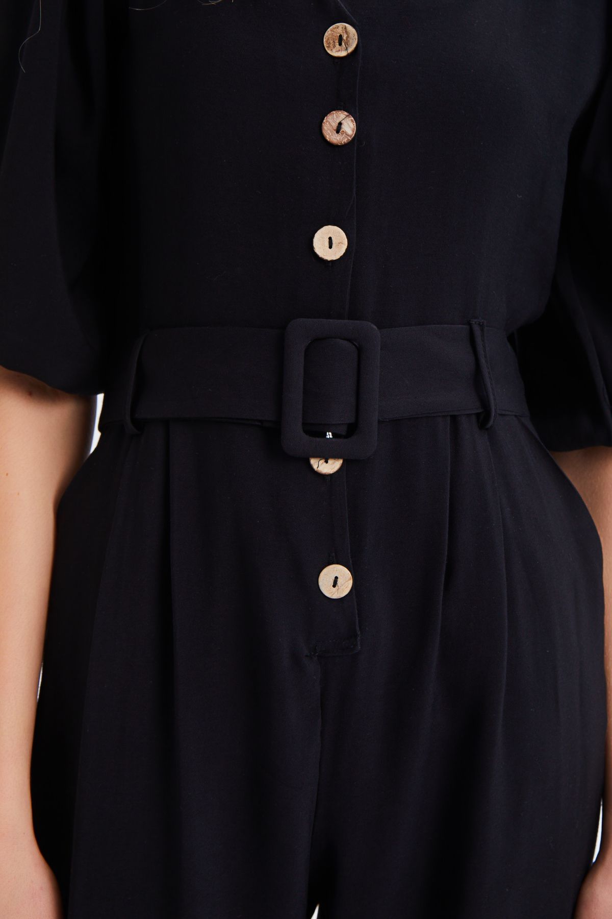 V Yaka Beli Kemerli Tulum Siyah