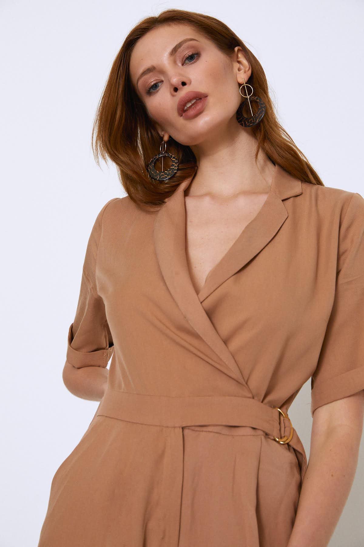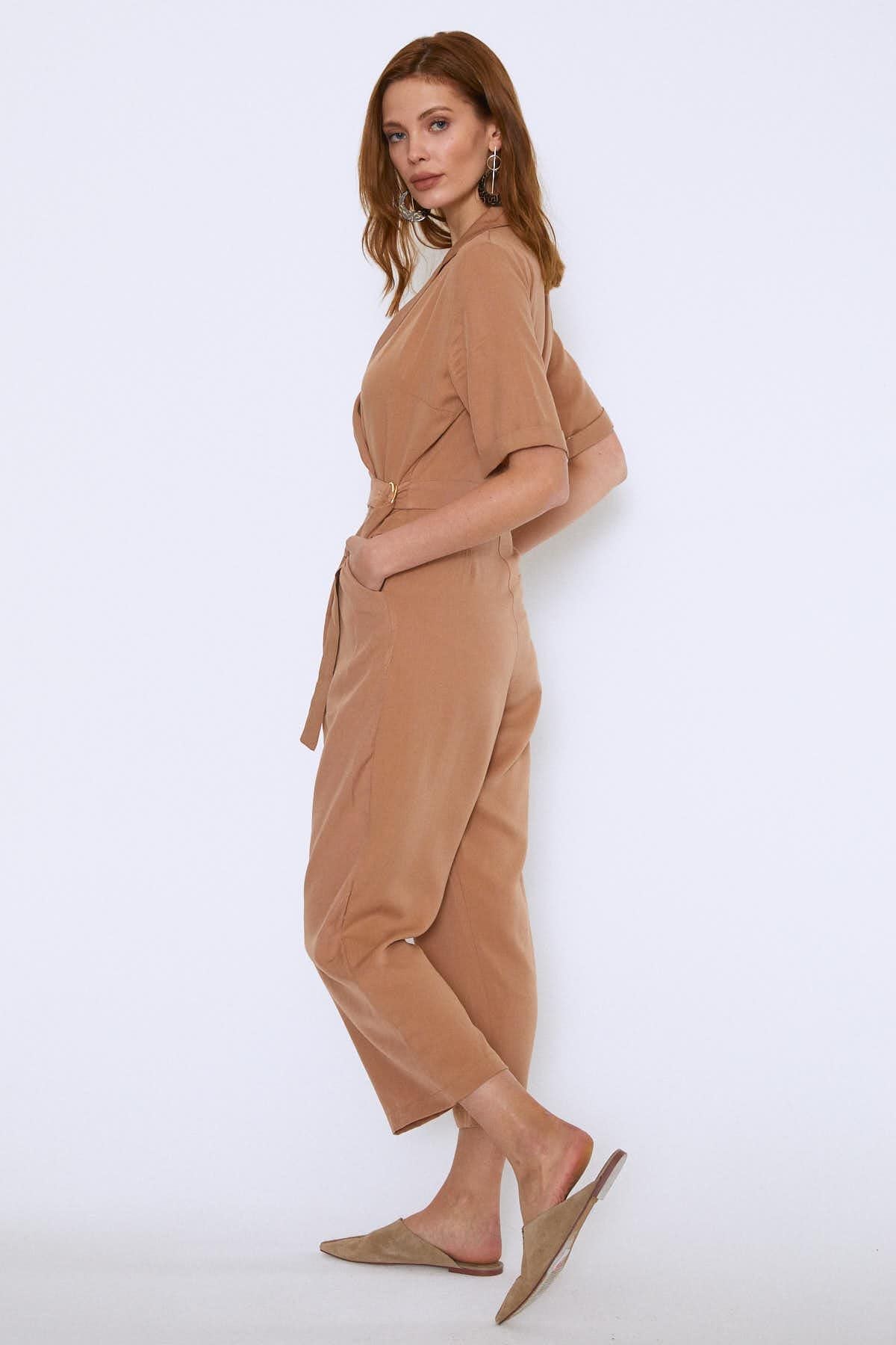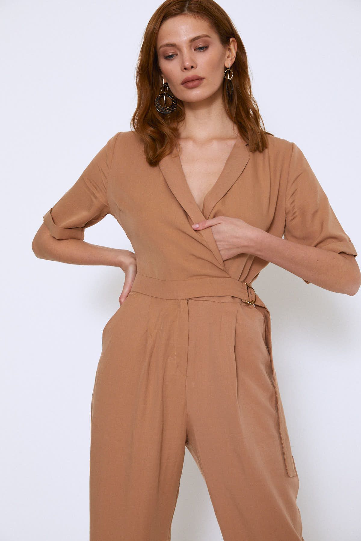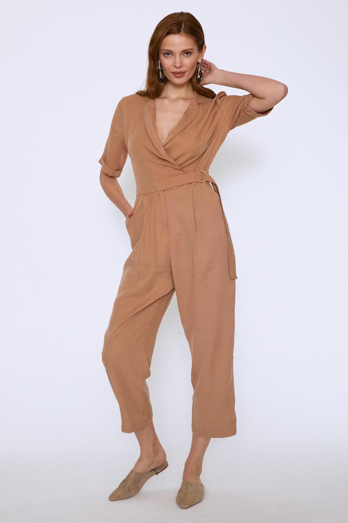 Tek parçanın stil duruşundan faydalanılan beli kuşaklı v yaka tulum, istediğin zaman işte, istediğin zaman gecelerde seninle.