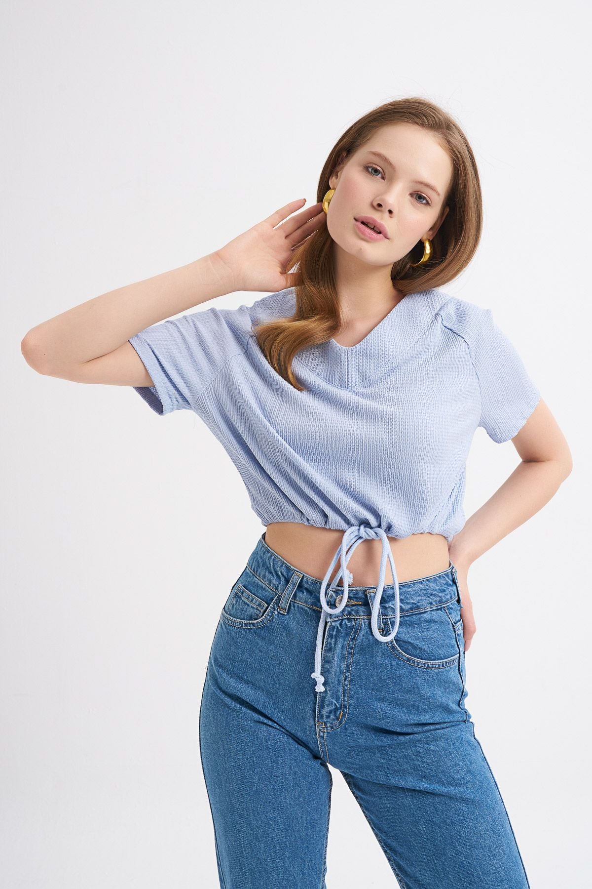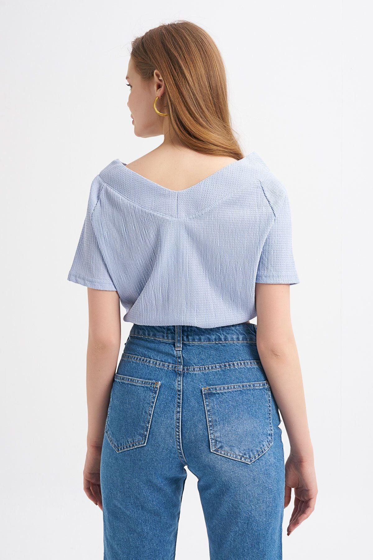 Bağlama Detaylı V Yaka Bluz Mavi