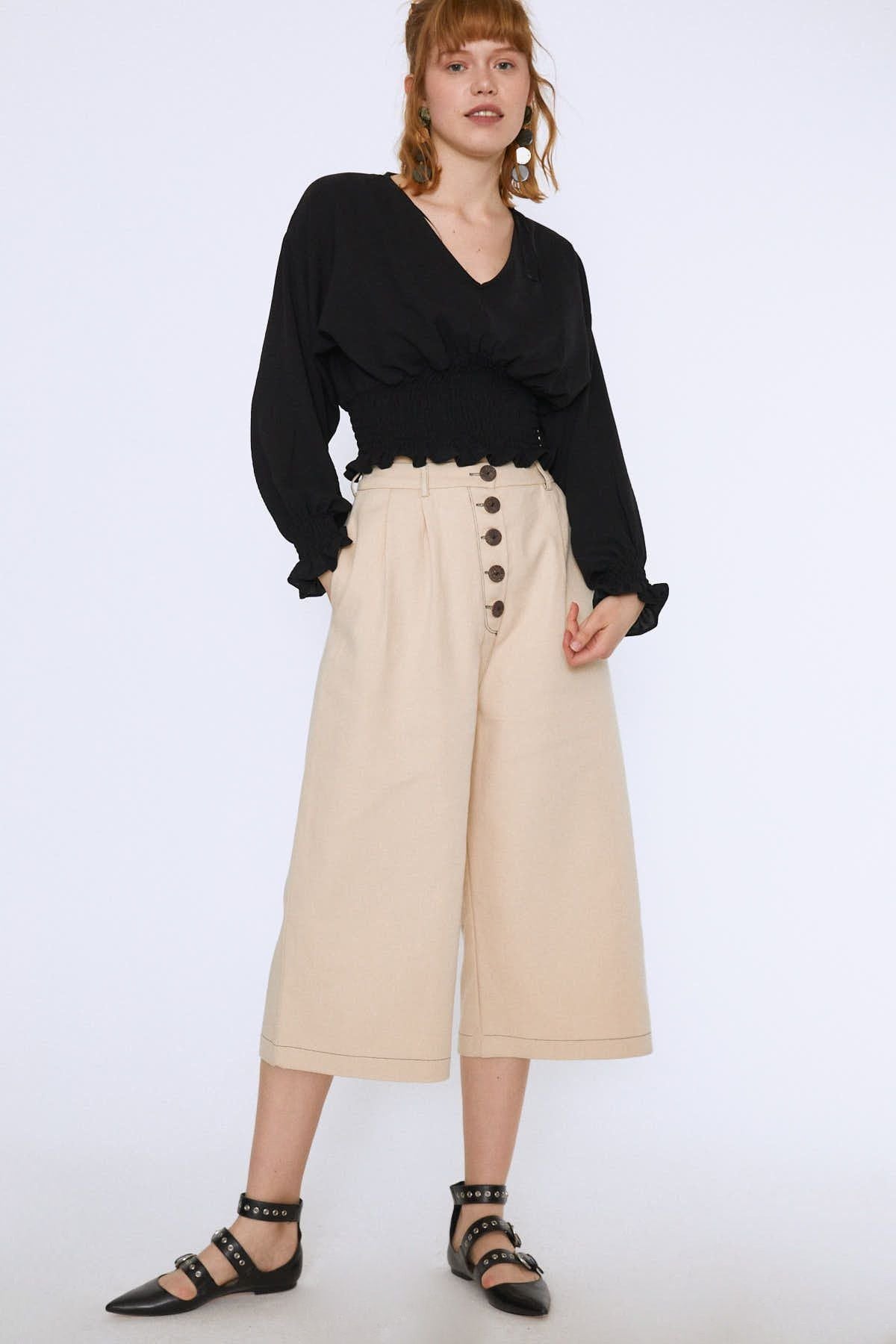 Kusursuz bir görünüm elde etmen için mükemmel bir kalıpla şekillendirilen beli gipeli crop bluz, v yakası ile rahat bir alternatif yaratıyor.