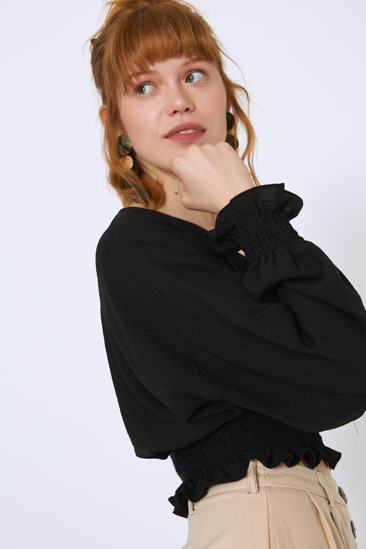 Beli Gipeli V Yaka Crop Bluz Siyah