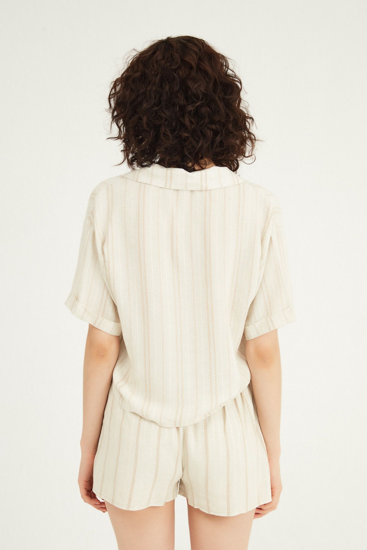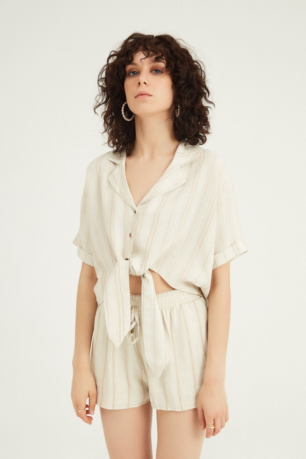 Yazın sıcacık dokusunu çizgileriyle üzerinde taşıyan modern kalıbı ve dikkat çekici kesimi ile bağlama detaylı bluz, tam da dolabında olmasını isteyeceğin türden bir parça.