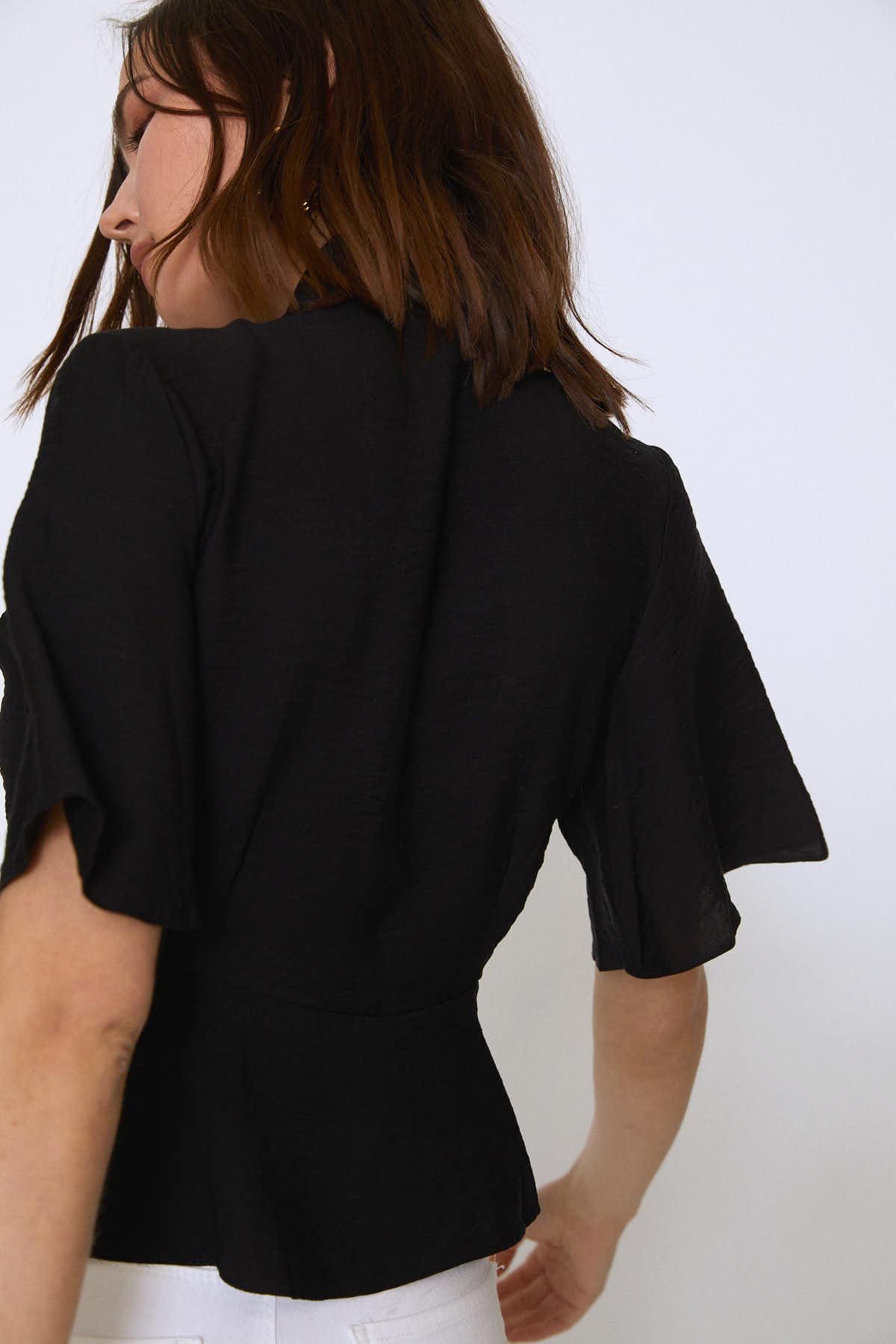 V Yaka Bağlamalı Bluz Siyah