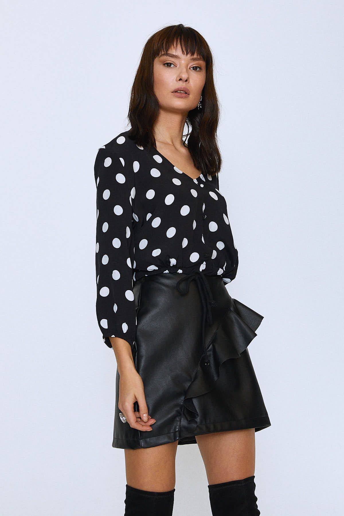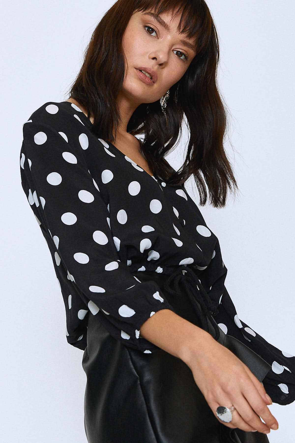 Puantiye deseni ve romantik formu ile geçmişe doğru şık bir yolculuğa çıkaran bluzla, tarza zarif etki.
