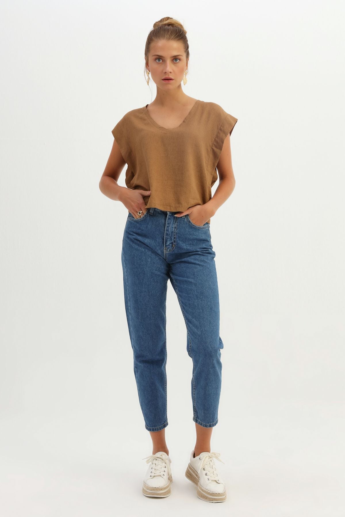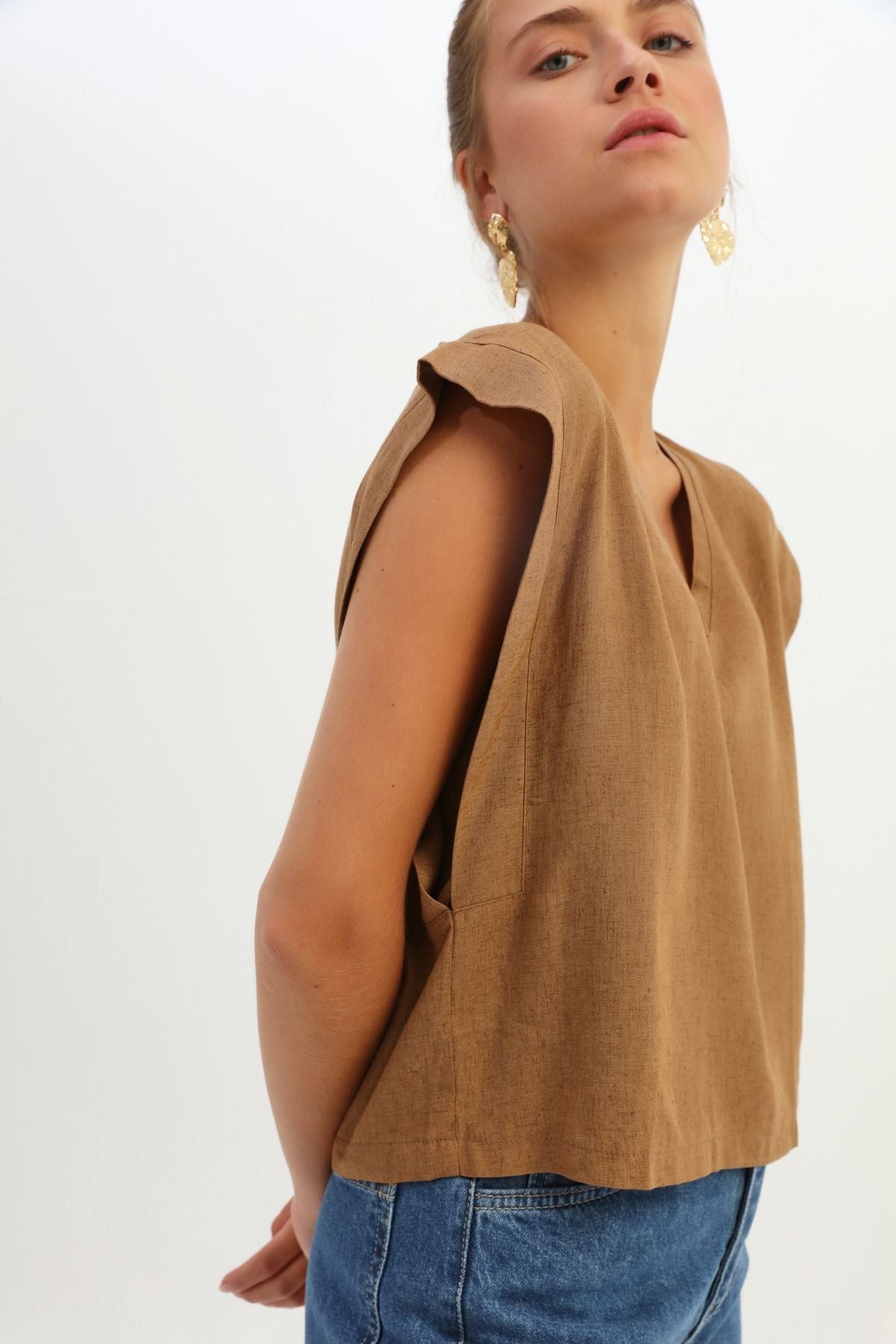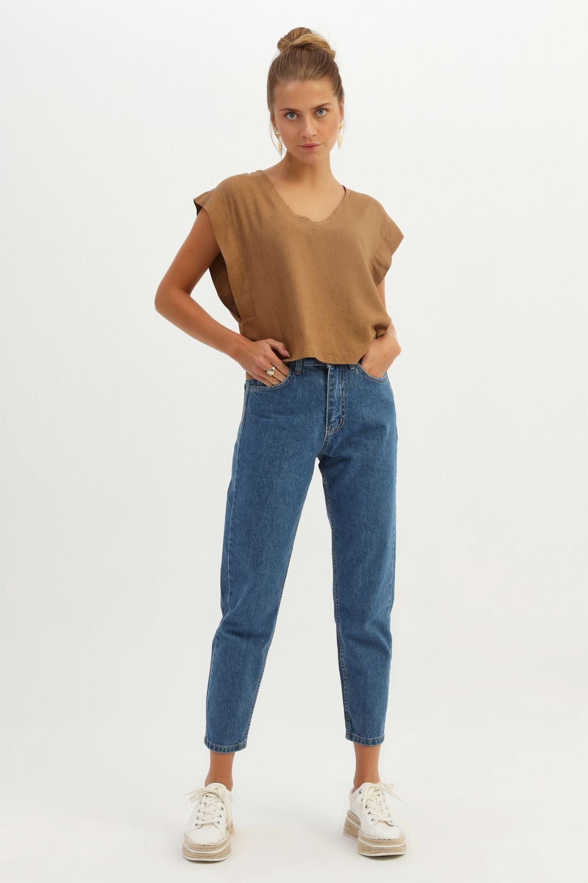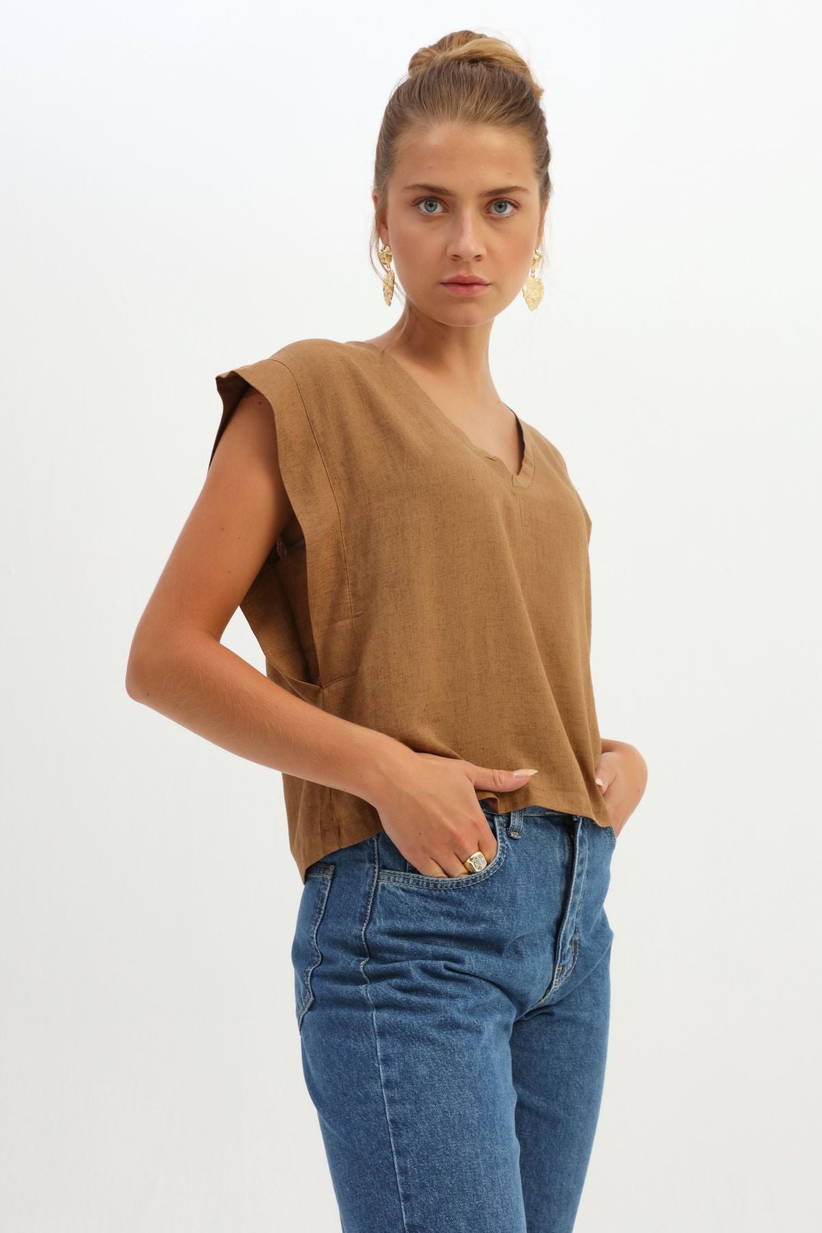 V Yaka Keten Bluz Kahverengi